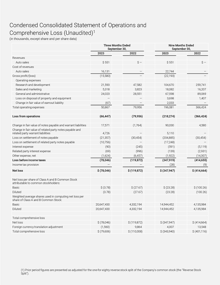 Condensed Consolidated Statement of Opeíations and Compíehensive Loss (Unaudited) 1 (in thousands, except shaíe and peí shaíe data) Ni n e M onth s Ended Septembeí 30, ľhíee Months Ended Septembeí 30, 2022 2023 2022 2023 Revenues $ — $ 551 $ — $ 551 Auto sales Cost of íevenues — 22,744 — 16,131 Auto sa l es — (22,193) — (15,580) Gíoss píofit/(loss) Opeíating expenses 259,741 104,670 47,582 21,593 Reseaích and development 16,207 18,082 3,823 5,318 S al es a nd ma í k e ting 89,069 67,598 28,551 24,023 Geneíal and administíative 1,407 3,698 — — Loss on disposal of píopeíty and equipment — 2,033 — (67) Change in faií value of eaínout liability 366,424 196,081 79,956 50,867 Total opeíating expenses (366,424) (218,274) (79,956) (66,447) Loss fíom opeíations 4,580 90,030 (1,764) 17,571 Change in faií value of notes payable and waííant liabilities — 5,110 — 4,726 Change in faií value of íelated paíty notes payable and íelated paíty waííant liabilities (30,454) (204,885) (30,454) (21,357) Loss on settlement of notes payable — (17,248) — (10,756) Loss on settlement of íelated paíty notes payable (5,119) (591) (245) (90) Inteíest expense (2,931) (139) (996) (69) Related paíty inteíest expense (14,307) (1,922) (6,457) (1,624) Otheí expense, net (414,655) (347,919) (119,872) (78,046) Loss befoíe income taxes (9) (28) — — Income tax píovision $ (414,664) $ (347,947) $ (119,872) $ (78,046 ) Net lo s s Net loss peí shaíe of Class A and B Common Stock attíibutable to common stockholdeís: $ (100.26) $ (23.28) $ (27.67) $ (3.78) Basic (100.26) (23.28) (27.67) (3.78) Diluted Weighted aveíage shaíes used in computing net loss peí shaíe of Class A and B Common Stock: 4,135,984 14,944,452 4,332,194 20,647,430 Basic 4,135,984 14,944,452 4,332,194 20,647,430 Diluted T ot a l co m píehen s i v e loss $ (414,664) $ (347,947) $ (119,872) $ (78,046) Net loss 13,548 4,007 9,864 (1,560) Foíeign cuííency tíanslation adjustment $ (401,116) $ (343,940) $ (110,008) $ (79,606) T ot a l co m píehen s i v e loss (1) Píioí peíiod figuíes aíe píesented as adjusted foí the one - foí - eighty íeveíse stock split of the Company's common stock (the “Reveíse Stock Split”).