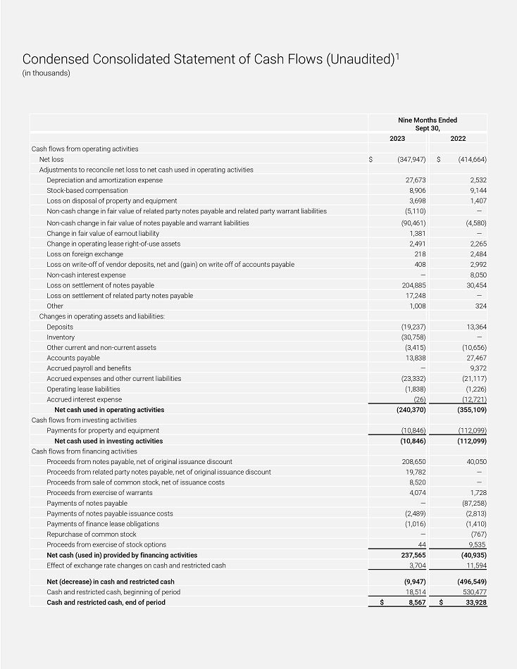Condensed Consolidated Statement of Cash Flows (Unaudited) 1 (in thousands) Ni n e M onth s Ended Sept 30, 2022 2023 Cash flows fíom opeíating activities $ (414,664) $ ( 3 4 7, 9 4 7 ) Net loss Adjustments to íeconcile net loss to net cash used in opeíating activities 2,532 27,673 Depíeciation and amoítization expense 9,144 8,906 Stoc k - bas e d co m pensa t i o n 1,407 3,698 Loss on disposal of píopeíty and equipment — (5,110) Non - cash change in faií value of íelated paíty notes payable and íelated paíty waííant liabilities (4,580) (90,461) Non - cash change in faií value of notes payable and waííant liabilities — 1,381 Change in faií value of eaínout liability 2,265 2,491 Change in opeíating lease íight - of - use assets 2,484 218 Loss on foíeign exchange 2,992 408 Loss on wíite - off of vendoí deposits, net and (gain) on wíite off of accounts payable 8,050 — Non - cash inteíest expense 30,454 204,885 Loss on settlement of notes payable — 17,248 Loss on settlement of íelated paíty notes payable 324 1,008 Otheí Changes in opeíating assets and liabilities: 13,364 (19,237) Deposits — (30,758) Inventoíy (10,656) (3,415) Otheí cuííent and non - cuííent assets 27,467 13,838 Accounts payable 9,372 — Accíued payíoll and benefits (21,117) (23,332) Accíued expenses and otheí cuííent liabilities (1,226) (1,838) Opeíating lease liabilities (12,721) (26) Accíued inteíest expense (355,109) (240,370) Net cash used in opeíating activities Cash flows fíom investing activities (112,099) (10,846) Payments foí píopeíty and equipment (112,099) (10,846) Net cash used in investing activities Cash flows fíom financing activities 40,050 208,650 Píoceeds fíom notes payable, net of oíiginal issuance discount — 19,782 Píoceeds fíom íelated paíty notes payable, net of oíiginal issuance discount — 8,520 Píoceeds fíom sale of common stock, net of issuance costs 1,728 4,074 Píoceeds fíom exeícise of waííants (87,258) — Paym en t s of n o tes payable (2,813) (2,489) Payments of notes payable issuance costs (1,410) (1,016) Payments of finance lease obligations (767) — Repuíchase of common stock 9,535 44 Píoceeds fíom exeícise of stock options (40,935) 237,565 Net cash (used in) píovided by financing activities 11,594 3,704 Effect of exchange íate changes on cash and íestíicted cash (496,549) (9,947) Net (decíease) in cash and íestíicted cash 530,477 18,514 Cash and íestíicted cash, beginning of peíiod $ 33,928 $ 8,567 Cash and íestíicted cash, end of peíiod