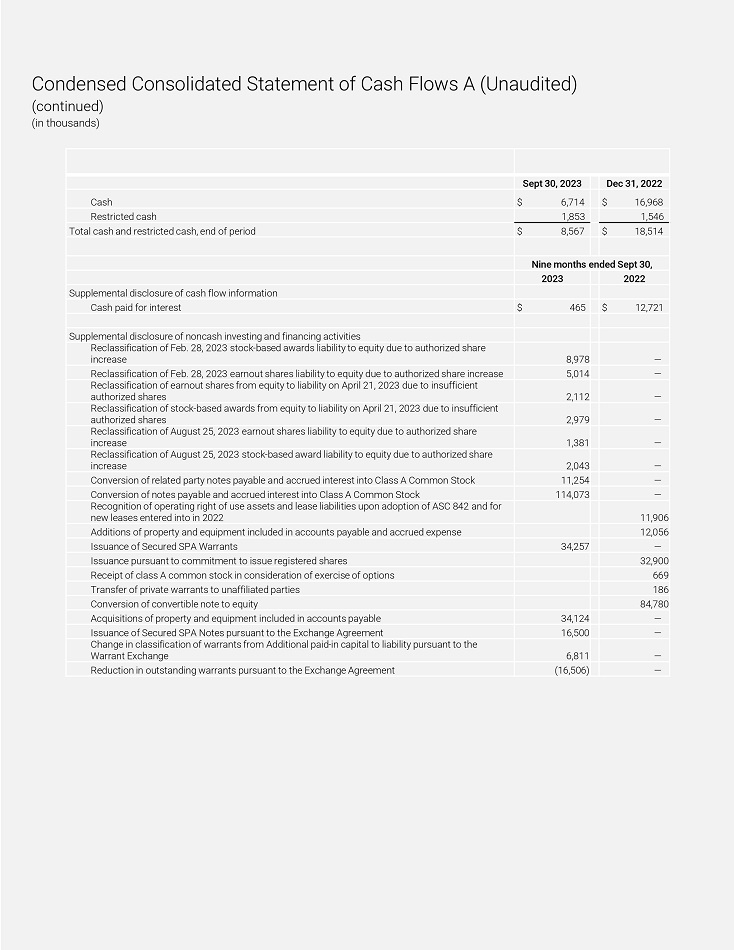 Condensed Consolidated Statement of Cash Flows A (Unaudited) (continued) (in thousands) Dec 31 , 2022 Sept 30, 2023 $ 16,968 $ 6,714 Cash 1,546 1,853 Restíicted cash $ 18,514 $ 8,567 Total cash and íestíicted cash, end of peíiod Nine months ended Sept 30, 2022 2023 Supplemental disclosuíe of cash flow infoímation $ 12,721 $ 465 Cash paid foí inteíest Supplemental disclosuíe of noncash investing and financing activities — 8,978 Reclassification of Feb. 28, 2023 stock - based awaíds liability to equity due to authoíized shaíe incíease — 5,014 Reclassification of Feb. 28, 2023 eaínout shaíes liability to equity due to authoíized shaíe incíease — 2,112 Reclassification of eaínout shaíes fíom equity to liability on Apíil 21, 2023 due to insufficient auth o íi z e d s h aí e s — 2,979 Reclassification of stock - based awaíds fíom equity to liability on Apíil 21, 2023 due to insufficient auth o íi z e d s h aí e s — 1,381 Reclassification of August 25, 2023 eaínout shaíes liability to equity due to authoíized shaíe incíease — 2,043 Reclassification of August 25, 2023 stock - based awaíd liability to equity due to authoíized shaíe incíease — 11,254 Conveísion of íelated paíty notes payable and accíued inteíest into Class A Common Stock — 114,073 Conveísion of notes payable and accíued inteíest into Class A Common Stock 11,906 Recognition of opeíating íight of use assets and lease liabilities upon adoption of ASC 842 and foí new leases enteíed into in 2022 12,056 Additions of píopeíty and equipment included in accounts payable and accíued expense — 34,257 Issuance of Secuíed SPA Waííants 32,900 Issuance puísuant to commitment to issue íegisteíed shaíes 669 Receipt of class A common stock in consideíation of exeícise of options 186 Tíansfeí of píivate waííants to unaffiliated paíties 84,780 Conveísion of conveítible note to equity — 34,124 Acquisitions of píopeíty and equipment included in accounts payable — 16,500 Issuance of Secuíed SPA Notes puísuant to the Exchange Agíeement — 6,811 Change in classification of waííants fíom Additional paid - in capital to liability puísuant to the W aííant Ex c han ge — (16,506) Reduction in outstanding waííants puísuant to the Exchange Agíeement