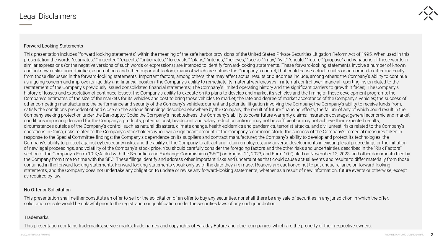 Legal Disclaimers Forward Looking Statements This presentation includes “forward looking statements” within the meaning of the safe harbor provisions of the United States Private Securities Litigation Reform Act of 1995. When used in this presentation the words “estimates,” “projected,” “expects,” “anticipates,” “forecasts,” “plans,” “intends,” “believes,” “seeks,” “may,” “will,” “should,” “future,” “propose” and variations of these words or similar expressions (or the negative versions of such words or expressions) are intended to identify forward - looking statements. These forward - looking statements involve a number of known and unknown risks, uncertainties, assumptions and other important factors, many of which are outside the Company’s control, that could cause actual results or outcomes to differ materially from those discussed in the forward - looking statements. Important factors, among others, that may affect actual results or outcomes include, among others: the Company’s ability to continue as a going concern and improve its liquidity and financial position; the Company's ability to remediate its material weaknesses in internal control over financial reporting; risks related to the restatement of the Company’s previously issued consolidated financial statements; The Company’s limited operating history and the significant barriers to growth it faces; The Company's history of losses and expectation of continued losses; the Company’s ability to execute on its plans to develop and market its vehicles and the timing of these development programs; the Company’s estimates of the size of the markets for its vehicles and cost to bring those vehicles to market; the rate and degree of market acceptance of the Company’s vehicles; the success of other competing manufacturers; the performance and security of the Company’s vehicles; current and potential litigation involving the Company; the Company’s ability to receive funds from, satisfy the conditions precedent of and close on the various financings described elsewhere by the Company; the result of future financing efforts, the failure of any of which could result in the Company seeking protection under the Bankruptcy Code; the Company's indebtedness; the Company's ability to cover future warranty claims; insurance coverage; general economic and market conditions impacting demand for the Company’s products; potential cost, headcount and salary reduction actions may not be sufficient or may not achieve their expected results; circumstances outside of the Company's control, such as natural disasters, climate change, health epidemics and pandemics, terrorist attacks, and civil unrest; risks related to the Company's operations in China; risks related to the Company’s stockholders who own a significant amount of the Company's common stock; the success of the Company's remedial measures taken in response to the Special Committee findings; the Company’s dependence on its suppliers and contract manufacturer; the Company's ability to develop and protect its technologies; the Company's ability to protect against cybersecurity risks; and the ability of the Company to attract and retain employees, any adverse developments in existing legal proceedings or the initiation of new legal proceedings, and volatility of the Company’s stock price. You should carefully consider the foregoing factors and the other risks and uncertainties described in the “Risk Factors” section of the Company’s Form 10 - K/A filed with the Securities and Exchange Commission (“SEC”) on August 21, 2023, and Form 10 - Q filed on November 13, 2023, and other documents filed by the Company from time to time with the SEC. These filings identify and address other important risks and uncertainties that could cause actual events and results to differ materially from those contained in the forward - looking statements. Forward - looking statements speak only as of the date they are made. Readers are cautioned not to put undue reliance on forward - looking statements, and the Company does not undertake any obligation to update or revise any forward - looking statements, whether as a result of new information, future events or otherwise, except as required by law. No Offer or Solicitation This presentation shall neither constitute an offer to sell or the solicitation of an offer to buy any securities, nor shall there be any sale of securities in any jurisdiction in which the offer, solicitation or sale would be unlawful prior to the registration or qualification under the securities laws of any such jurisdiction. Trademarks This presentation contains trademarks, service marks, trade names and copyrights of Faraday Future and other companies, which are the property of their respective owners. 2 © 2023 FARADAY FUTURE PROPRIETARY AND CONFIDENTIAL