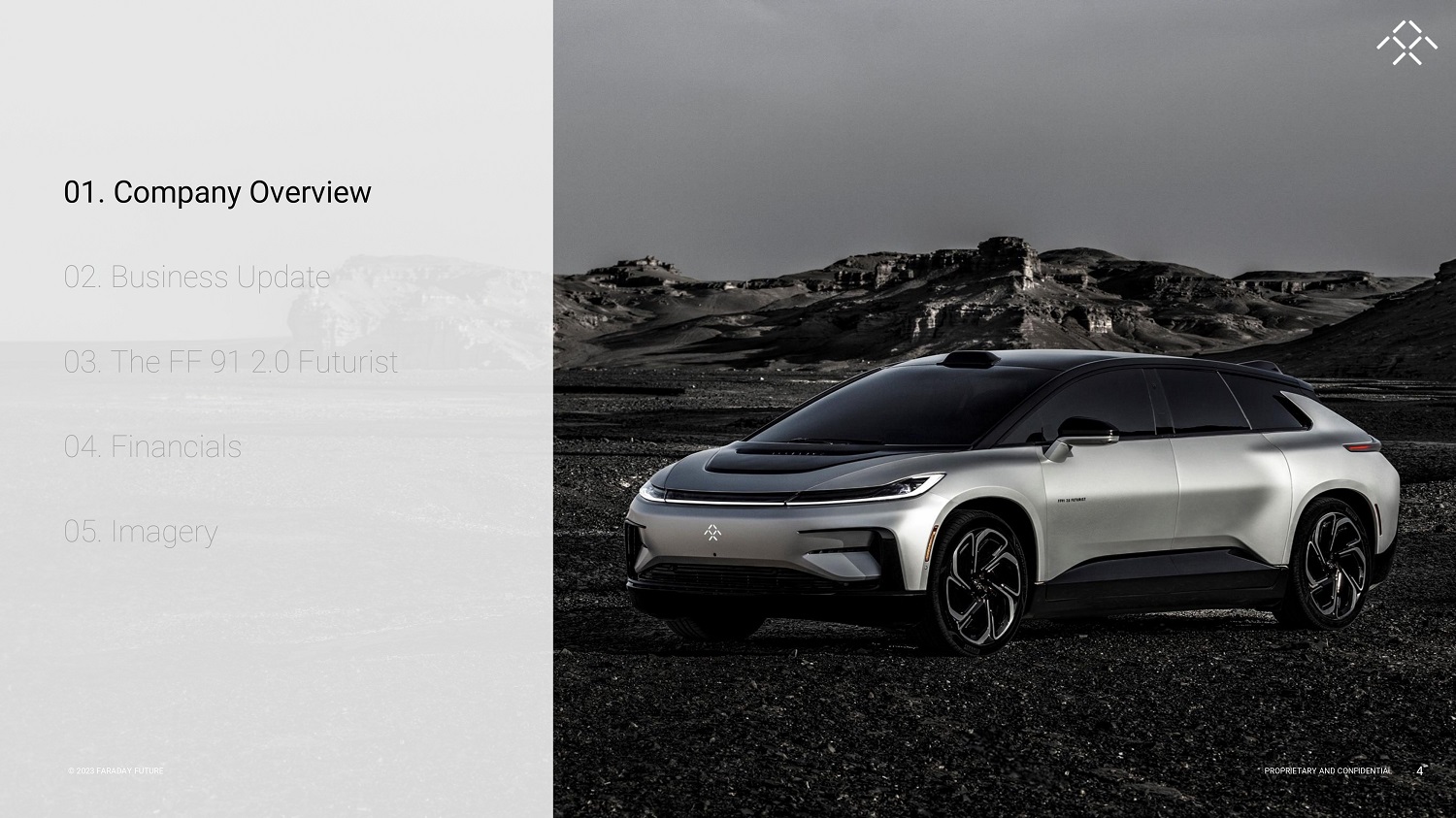 01. Company Overview 2. Business Update 3. The FF 91 2.0 Futurist 4. Financials 5. Imagery Table of Contents © 2023 F A RA D A Y F U T U RE P RO P RIE T A RY A N D C ON F ID EN T IA L 3 3 © 2023 FARADAY FUTURE PROPRIETARY AND CONFIDENTIAL
