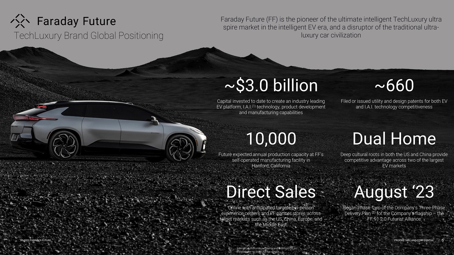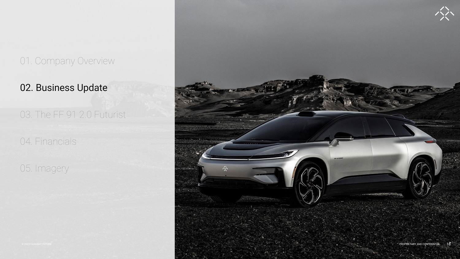 1. Company Overview 2. Business Update 3. The FF 91 2.0 Futurist 4. Financials 5. Imagery © 2023 F A RA D A Y F U T U RE P RO P RIE T A RY A N D C ON F ID EN T IA L 3 4 © 2023 FARADAY FUTURE PROPRIETARY AND CONFIDENTIAL