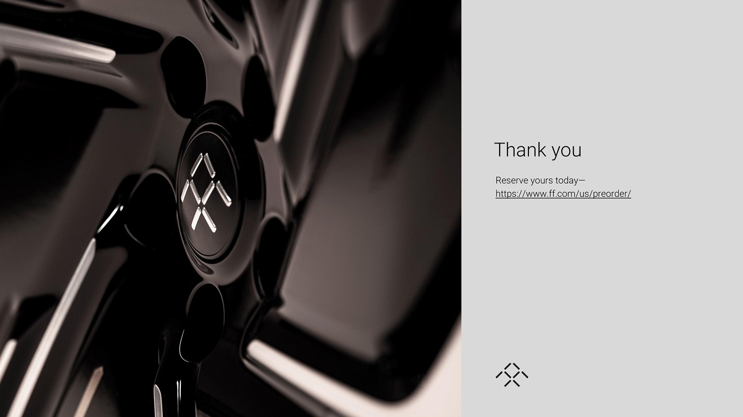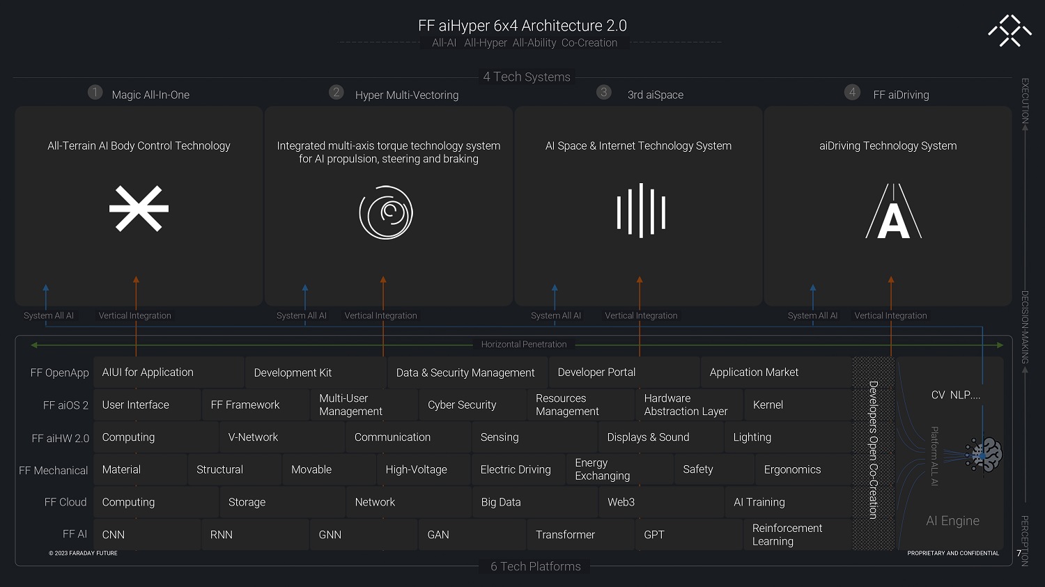 All - Terrain AI Body Control Technology Integrated multi - axis torque technology system for AI propulsion, steering and braking AI Space & Internet Technology System aiDriving Technology System 3r d a i Sp a ce Hyper Multi - Vectoring Magic All - In - One 1 2 3 FF aiHyper 6x4 Architecture 2.0 Ve r t i c al I n te gr a t i o n Ve r t i c al I n te gr a t i o n Ve r t i c al I n te gr a t i o n Ve r t i c al I n te gr a t i o n FF aiDriving 4 4 Tech Systems Horizontal Penetration L ighti n g Displays & Sound S en s i n g Ene rgy E x c ha n gi n g Electric Driving S a fet y Erg ono mic s AIUI for Application Deve l op m ent K it Application Market D a ta & Sec u r it y M a n a ge m ent D evel ope r P o r t a l C o mm un i c a ti on V - Net w ork C o m pu ti n g St ru ct ur a l Ma ter i a l Mo v ab le H i gh - V o lt a ge AI Training W eb3 B i g D a ta Ne t wo rk Stor a ge Com p u ti n g GP T T r a n s for mer R e i n f or ce m ent L e a r ni n g RNN GN N GA N Hardware Abstraction Layer R es our ces Man a ge m ent K ernel FF Fr a me w o rk User Interface M u lt i - U ser Man a ge m ent Cy be r Se c u r it y Developers Open Co - Creation FF OpenApp FF aiOS 2 FF aiHW 2.0 FF Mechanical FF C l ou d Pla t form ALL AI Sys tem All AI Sys tem All AI Sys tem All AI Sys tem All AI AI Engine CV NLP.... All - AI All - Hyper All - Ability Co - Creation 6 Tech Platforms EX E C UT I O N PE RC EPTI O N DE C I S IO N - M A KIN G FF AI CN N © 2023 FARADAY FUTURE PROPRIETARY AND CONFIDENTIAL 7
