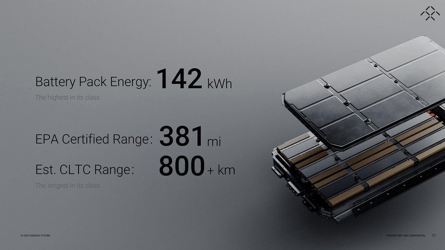 EPA C e rtifi e d Rang e ˖ 38 1 mi Battery P ack Energy: 14 2 kWh The highest in its class Est. CLTC Range ˖ The longest in its class 80 0 + km 11 © 2023 FARADAY FUTURE PROPRIETARY AND CONFIDENTIAL