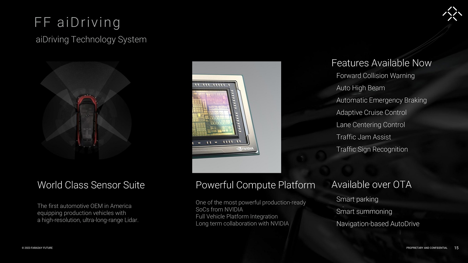 Hyper Multi - Vectoring Multi - axis torque system for propulsion, steering and braking empowered by AI Hypercar Acceleration Class - leading Range Moat Pack Structure Steering by Propulsion 14 © 2023 FARADAY FUTURE PROPRIETARY AND CONFIDENTIAL