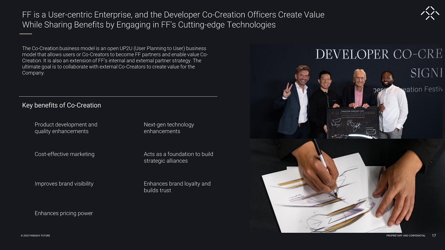 FF is a User - centric Enterprise, and the Developer Co - Creation Officers Create Value While Sharing Benefits by Engaging in FF's Cutting - edge Technologies C o - Cr e ation The Co - Creation business model is an open UP2U (User Planning to User) business model that allows users or Co - Creators to become FF partners and enable value Co - Creation. It is also an extension of FF’s internal and external partner strategy. The ultimate goal is to collaborate with external Co - Creators to create value for the Company. Key benefits of Co - Creation Product development and quality enhancements Nex t - g en t e c hno l o g y enhancements Cost - effective marketing Acts as a foundation to build strategic alliances Improves brand visibility Enhances brand loyalty and builds trust Enhances pricing power 17 © 2023 FARADAY FUTURE PROPRIETARY AND CONFIDENTIAL