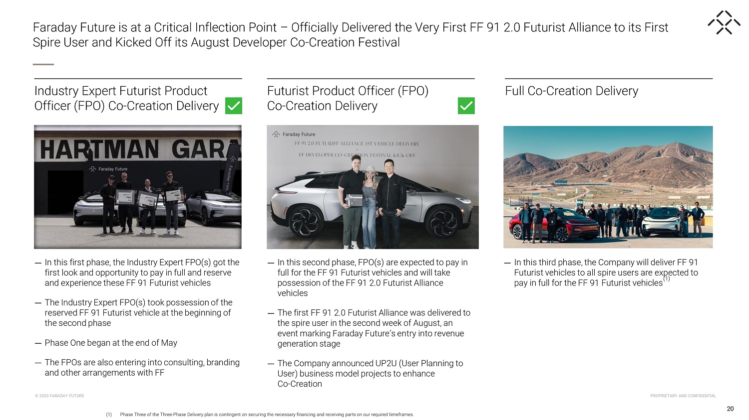 On April 14, 2023, Faraday Future’s First Production FF 91 Vehicle Came off the Line at its FF ieFactory California 19 © 2023 FARADAY FUTURE PROPRIETARY AND CONFIDENTIAL