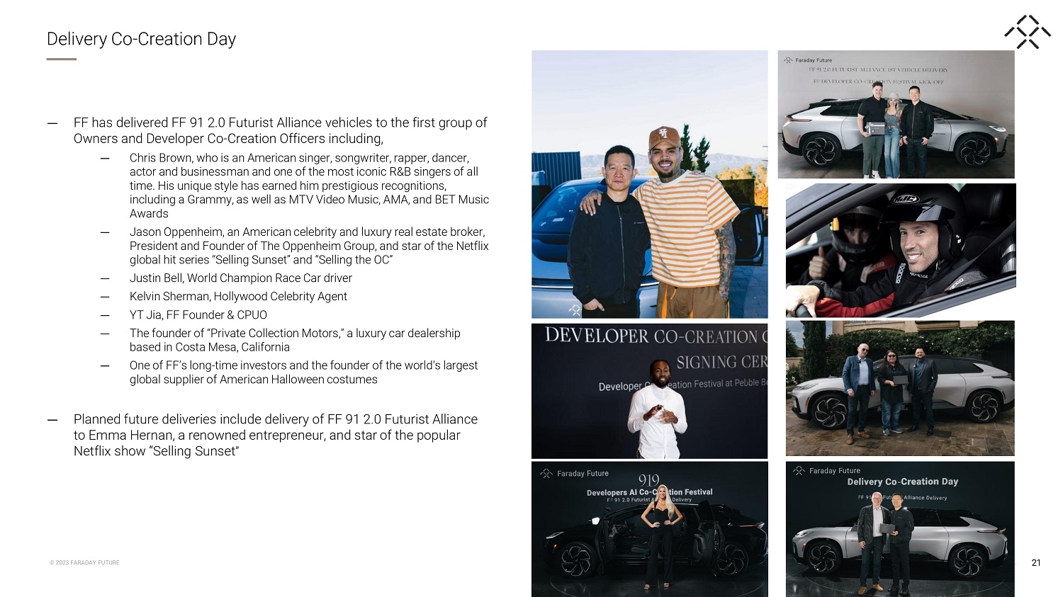 © 2023 FARADAY FUTURE PROPRIETARY AND CONFIDENTIAL 20 Faraday Future is at a Critical Inflection Point – Officially Delivered the Very First FF 91 2.0 Futurist Alliance to its First Spire User and Kicked Off its August Developer Co - Creation Festival (1) Phase Three of the Three - Phase Delivery plan is contingent on securing the necessary financing and receiving parts on our required timeframes. Full Co - Creation Delivery — In this third phase, the Company will deliver FF 91 Futurist vehicles to all spire users are expected to pay in full for the FF 91 Futurist vehicles ( 1 ) Industry Expert Futurist Product Officer (FPO) Co - Creation Delivery — In this first phase, the Industry Expert FPO(s) got the first look and opportunity to pay in full and reserve and experience these FF 91 Futurist vehicles — The Industry Expert FPO(s) took possession of the reserved FF 91 Futurist vehicle at the beginning of the second phase — Phase One began at the end of May — The FPOs are also entering into consulting, branding and other arrangements with FF Futurist Product Officer (FPO) Co - Creation Delivery — In this second phase, FPO(s) are expected to pay in full for the FF 91 Futurist vehicles and will take possession of the FF 91 2.0 Futurist Alliance vehicles — The first FF 91 2.0 Futurist Alliance was delivered to the spire user in the second week of August, an event marking Faraday Future’s entry into revenue ge n e ra t io n s t a ge — The Company announced UP2U (User Planning to User) business model projects to enhance Co - Creation