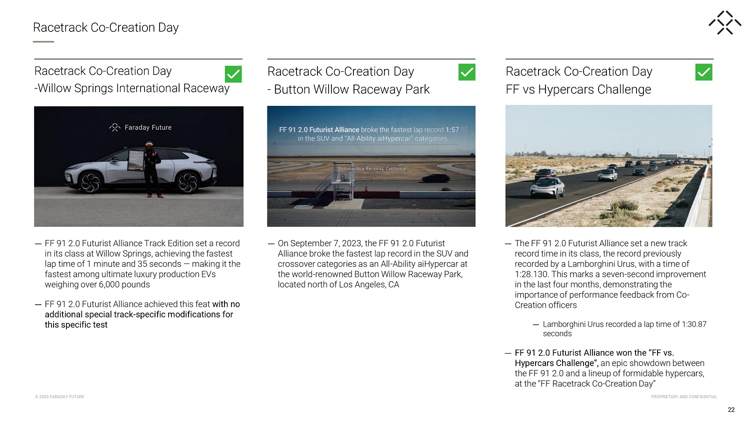 Racetrack Co - Creation Day Racetrack Co - Creation Day FF vs Hypercars Challenge — The FF 91 2.0 Futurist Alliance set a new track record time in its class, the record previously recorded by a Lamborghini Urus, with a time of 1:28.130. This marks a seven - second improvement in the last four months, demonstrating the importance of performance feedback from Co - Creation officers — Lamborghini Urus recorded a lap time of 1:30.87 seconds — FF 91 2.0 Futurist Alliance won the “FF vs. Hypercars Challenge”, an epic showdown between the FF 91 2 . 0 and a lineup of formidable hypercars, at the “FF Racetrack Co - Creation Day” Racetrack Co - Creation Day - Willow Springs International Raceway — FF 91 2.0 Futurist Alliance Track Edition set a record in its class at Willow Springs, achieving the fastest lap time of 1 minute and 35 seconds — making it the fastest among ultimate luxury production EVs weighing over 6,000 pounds — FF 91 2.0 Futurist Alliance achieved this feat with no additional special track - specific modifications for this specific test Racetrack Co - Creation Day - B ut to n W i llo w R ace w a y Park — On September 7, 2023, the FF 91 2.0 Futurist Alliance broke the fastest lap record in the SUV and crossover categories as an All - Ability aiHypercar at the world - renowned Button Willow Raceway Park, located north of Los Angeles, CA © 2023 FARADAY FUTURE PROPRIETARY AND CONFIDENTIAL 22