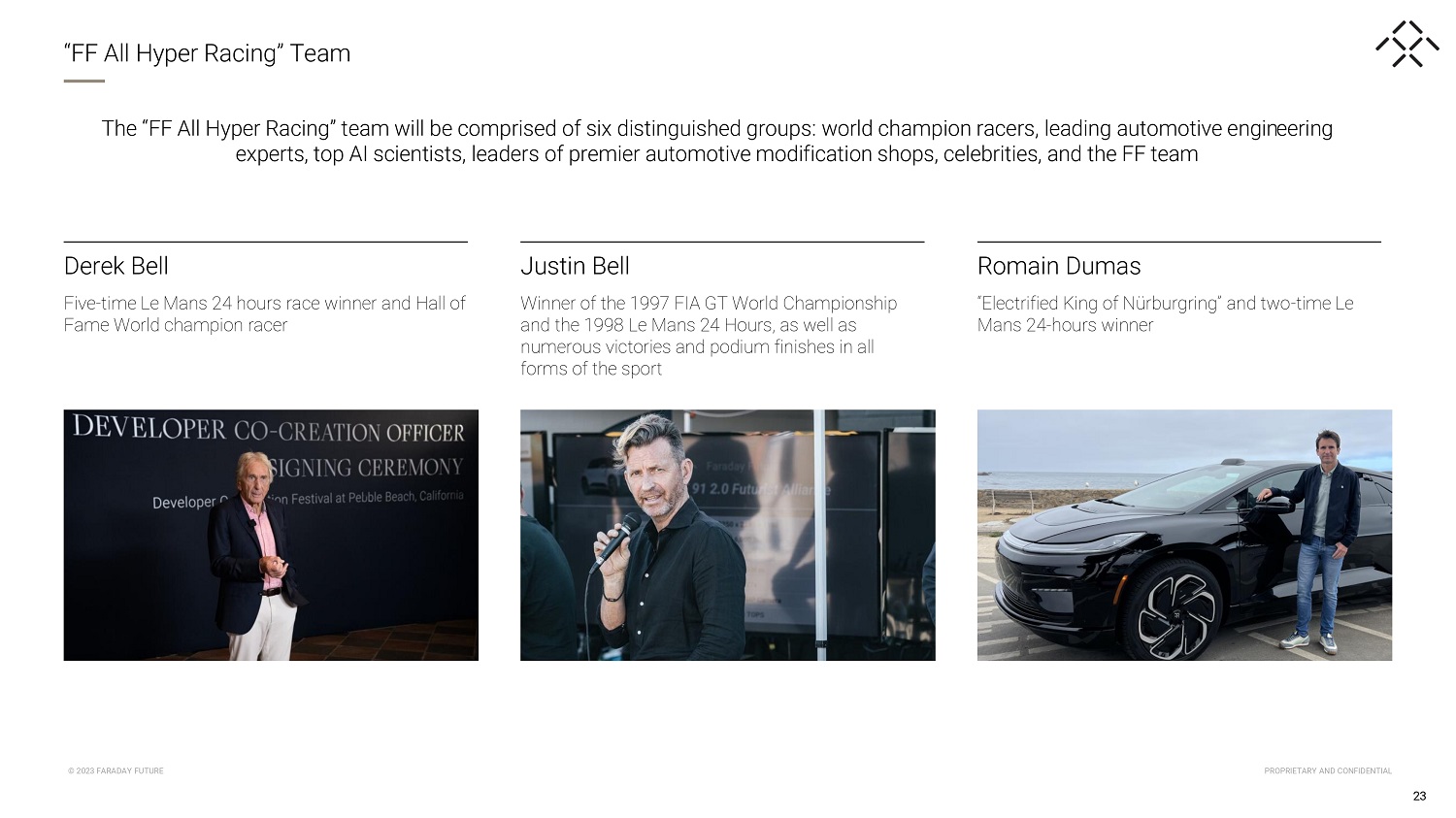 “FF All Hyper Racing” Team The “FF All Hyper Racing” team will be comprised of six distinguished groups: world champion racers, leading automotive engineering experts, top AI scientists, leaders of premier automotive modification shops, celebrities, and the FF team Derek Bell Five - time Le Mans 24 hours race winner and Hall of Fame World champion racer Justin Bell Winner of the 1997 FIA GT World Championship and the 1998 Le Mans 24 Hours, as well as numerous victories and podium finishes in all forms of the sport Romain Dumas “Electrified King of Nürburgring” and two - time Le Mans 24 - hours winner © 2023 FARADAY FUTURE PROPRIETARY AND CONFIDENTIAL 23