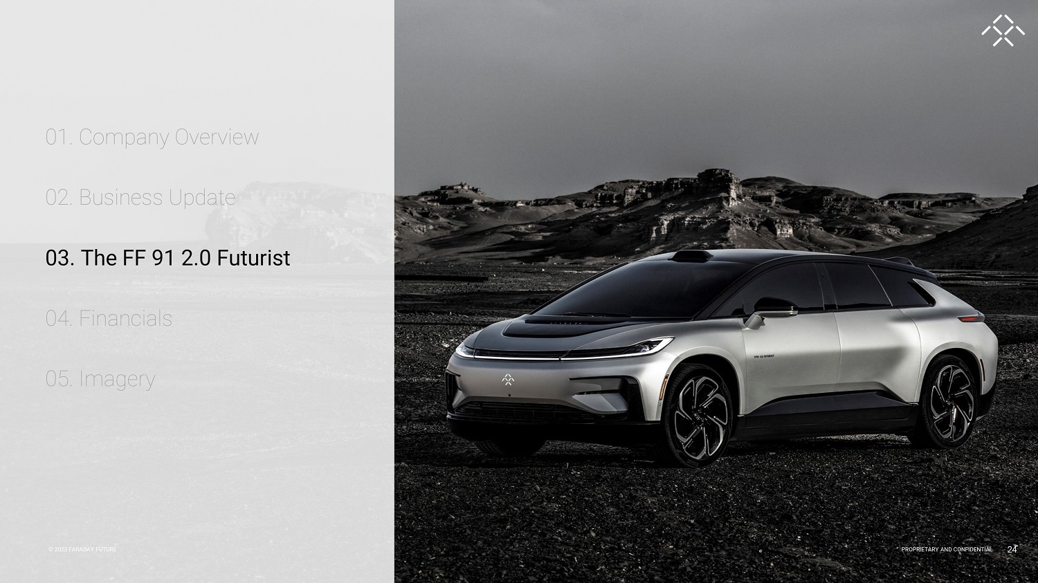 1. Company Overview 2. Business Update 3. The FF 91 2.0 Futurist 4. Financials 5. Imagery © 2023 F A RA D A Y F U T U RE P RO P RIE T A RY A N D C ON F ID EN T IA L 24 24 © 2023 FARADAY FUTURE PROPRIETARY AND CONFIDENTIAL