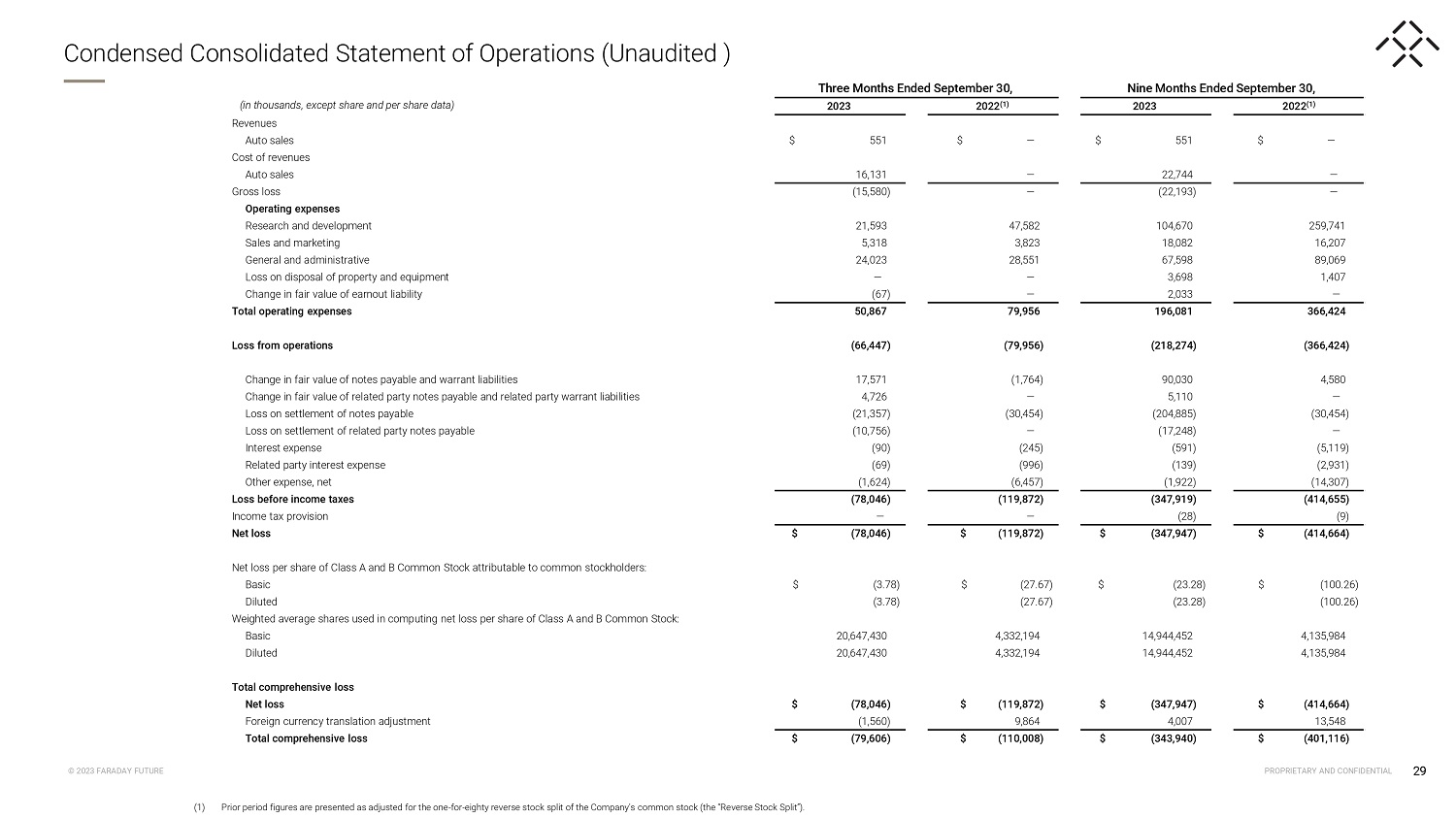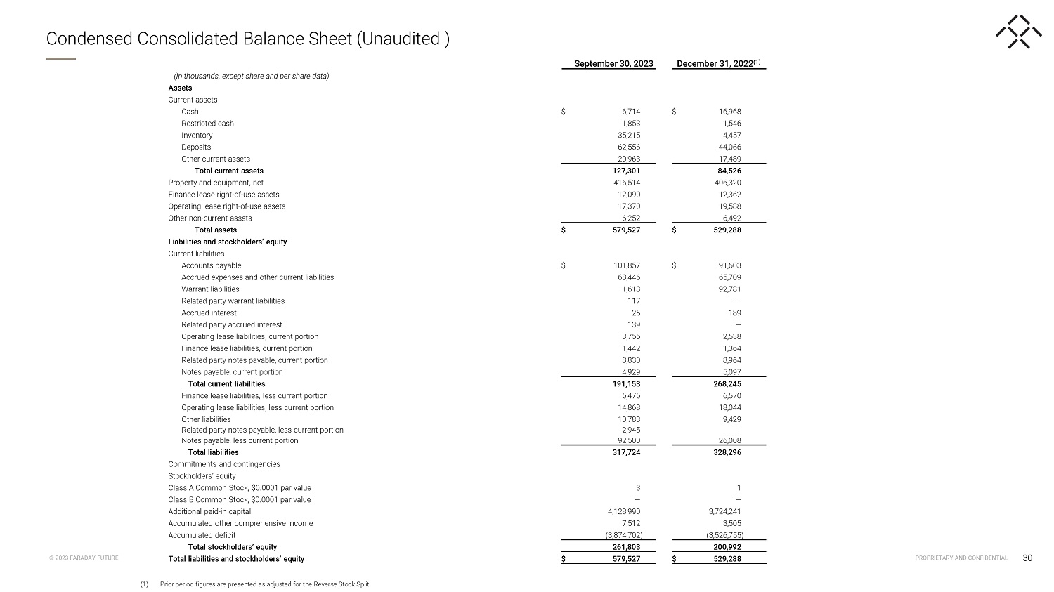 © 2023 FARADAY FUTURE PROPRIETARY AND CONFIDENTIAL 29 Condensed Consolidated Statement of Operations (Unaudited ) Nine Months Ended September 30, Three Months Ended September 30, 2022 (1) 2023 2022 (1) 2023 (in thousands, except share and per share data) Revenues $ — $ 551 $ — $ 551 Auto sales Cost of revenues — 22,744 — 16,131 Auto sales — (22,193) — (15,580) Gross loss Operating expenses 259,741 104,670 47,582 21,593 Research and development 16,207 18,082 3,823 5,318 Sales and marketing 89,069 67,598 28,551 24,023 General and administrative 1,407 3,698 — — Loss on disposal of property and equipment — 2,033 — (67) Change in fair value of earnout liability 366,424 196,081 79,956 50,867 Total operating expenses (366,424) (218,274) (79,956) (66,447) Loss from operations 4,580 90,030 (1,764) 17,571 Change in fair value of notes payable and warrant liabilities — 5,110 — 4,726 Change in fair value of related party notes payable and related party warrant liabilities (30,454) (204,885) (30,454) (21,357) Loss on settlement of notes payable — (17,248) — (10,756) Loss on settlement of related party notes payable (5,119) (591) (245) (90) Interest expense (2,931) (139) (996) (69) Related party interest expense (14,307) (1,922) (6,457) (1,624) Other expense, net (414,655) (347,919) (119,872) (78,046) Loss before income taxes (9) (28) — — Income tax provision $ (414,664) $ (347,947) $ (119,872) $ (78,046) Net loss Net loss per share of Class A and B Common Stock attributable to common stockholders: $ (100.26) $ (23.28) $ (27.67) $ (3.78) Basic (100.26) (23.28) (27.67) (3.78) Diluted Weighted average shares used in computing net loss per share of Class A and B Common Stock: 4,135,984 14,944,452 4,332,194 20,647,430 Basic 4,135,984 14,944,452 4,332,194 20,647,430 Diluted Total comprehensive loss $ (414,664) $ (347,947) $ (119,872) $ (78,046) Net loss 13,548 4,007 9,864 (1,560) Foreign currency translation adjustment $ (401,116) $ (343,940) $ (110,008) $ (79,606) Total comprehensive loss (1) Prior period figures are presented as adjusted for the one - for - eighty reverse stock split of the Company's common stock (the “Reverse Stock Split”).