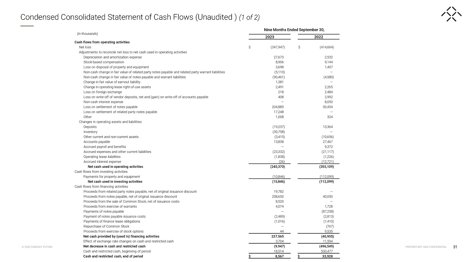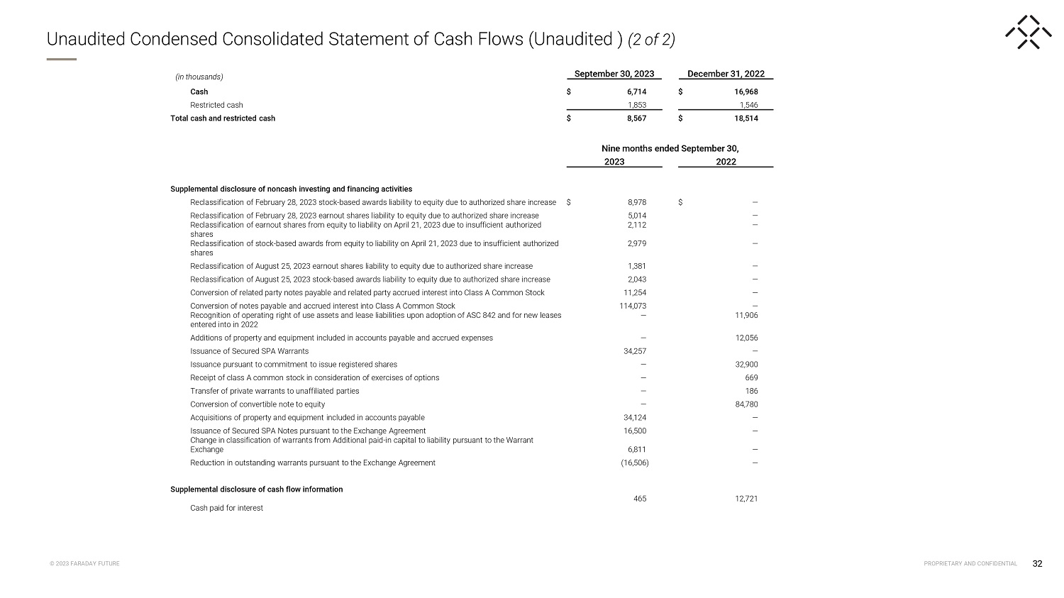 Condensed Consolidated Statement of Cash Flows (Unaudited ) (1 of 2) 31 © 2023 FARADAY FUTURE PROPRIETARY AND CONFIDENTIAL Nine Months Ended September 30, (i n t housan ds) 2022 2023 Cash flows from operating activities $ (414,664) $ (347,947) Net loss Adjustments to reconcile net loss to net cash used in operating activities 2,532 27,673 Depreciation and amortization expense 9,144 8,906 Stock - based compensation 1,407 3,698 Loss on disposal of property and equipment — (5,110) Non - cash change in fair value of related party notes payable and related party warrant liabilities (4,580) (90,461) Non - cash change in fair value of notes payable and warrant liabilities — 1,381 Change in fair value of earnout liability 2,265 2,491 Change in operating lease right - of - use assets 2,484 218 Loss on foreign exchange 2,992 408 Loss on write - off of vendor deposits, net and (gain) on write - off of accounts payable 8,050 — Non - cash interest expense 30,454 204,885 Loss on settlement of notes payable — 17,248 Loss on settlement of related party notes payable 324 1,008 Other Changes in operating assets and liabilities: 13,364 (19,237) Deposits — (30,758) Inventory (10,656) (3,415) Other current and non - current assets 27,467 13,838 Accounts payable 9,372 — Accrued payroll and benefits (21,117) (23,332) Accrued expenses and other current liabilities (1,226) (1,838) Operating lease liabilities (12,721) (26) Accrued interest expense (355,109) (240,370) Net cash used in operating activities Cash flows from investing activities (112,099) (10,846) Payments for property and equipment (112,099) (10,846) Net cash used in investing activities Cash flows from financing activities — 19,782 Proceeds from related party notes payable, net of original issuance discount 40,050 208,650 Proceeds from notes payable, net of original issuance discount — 8,520 Proceeds from the sale of Common Stock, net of issuance costs 1,728 4,074 Proceeds from exercise of warrants (87,258) — Payments of notes payable (2,813) (2,489) Payment of notes payable issuance costs (1,410) (1,016) Payments of finance lease obligations (767) — Repurchase of Common Stock 9,535 44 Proceeds from exercise of stock options (40,935) 237,565 Net cash provided by (used in) financing activities 11,594 3,704 Effect of exchange rate changes on cash and restricted cash (496,549) (9,947) Net decrease in cash and restricted cash 530,477 18,514 Cash and restricted cash, beginning of period $ 33,928 $ 8,567 Cash and restricted cash, end of period