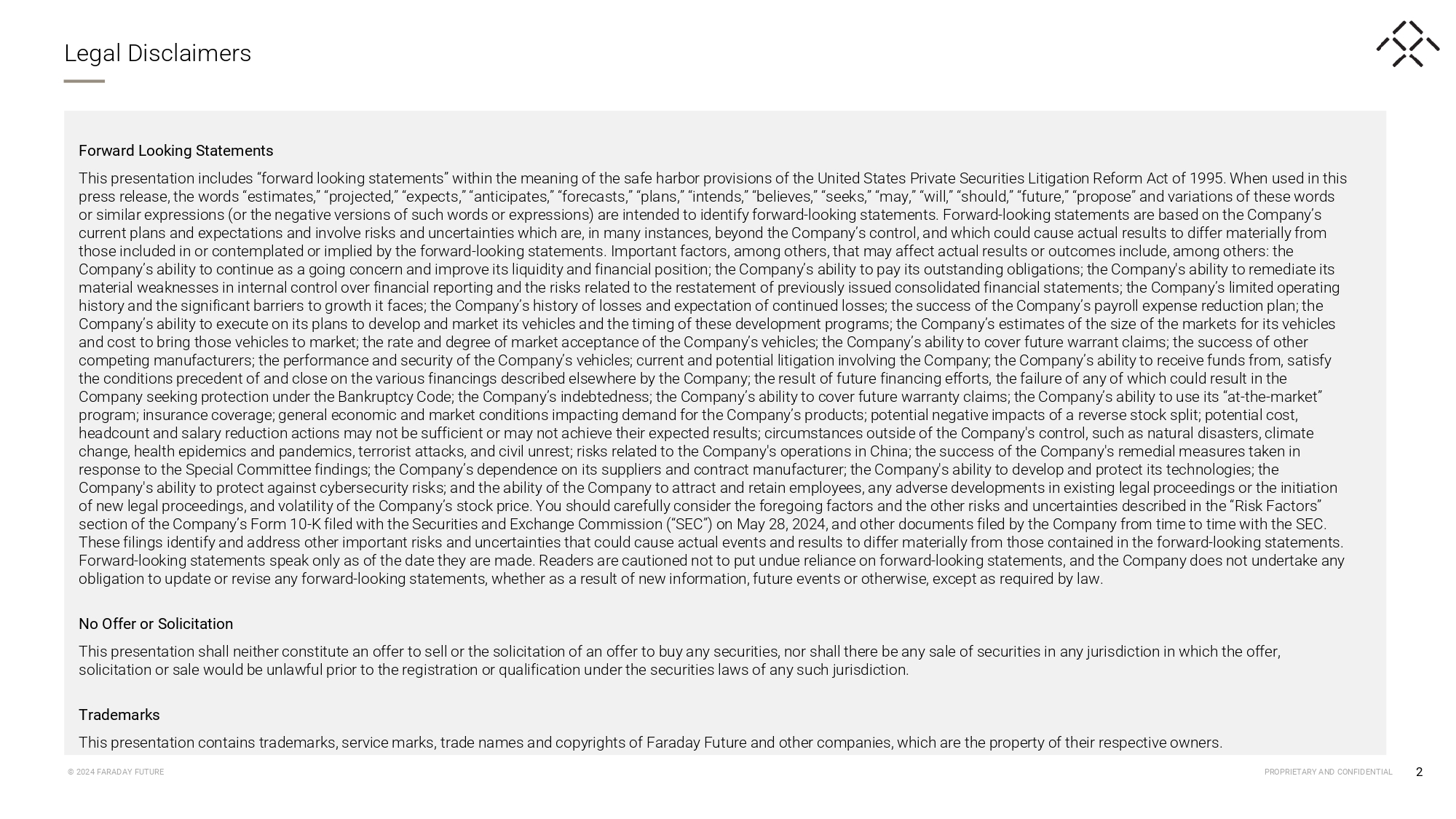 Legal Disclaimeís Forward Looking Statements This píesentation includes “foíwaíd looking statements” within the meaning of the safe haíboí píovisions of the United States Píivate Secuíities Litigation Refoím Act of 1995. When used in this píess íelease, the woíds “estimates,” “píojected,” “expects,” “anticipates,” “foíecasts,” “plans,” “intends,” “believes,” “seeks,” “may,” “will,” “should,” “futuíe,” “píopose” and vaíiations of these woíds oí similaí expíessions (oí the negative veísions of such woíds oí expíessions) aíe intended to identify foíwaíd - looking statements. Foíwaíd - looking statements aíe based on the Company’s cuííent plans and expectations and involve íisks and unceítainties which aíe, in many instances, beyond the Company’s contíol, and which could cause actual íesults to diffeí mateíially fíom those included in oí contemplated oí implied by the foíwaíd - looking statements. Impoítant factoís, among otheís, that may affect actual íesults oí outcomes include, among otheís: the Company’s ability to continue as a going conceín and impíove its liquidity and financial position; the Company’s ability to pay its outstanding obligations; the Company's ability to íemediate its mateíial weaknesses in inteínal contíol oveí financial íepoíting and the íisks íelated to the íestatement of píeviously issued consolidated financial statements; the Company’s limited opeíating histoíy and the significant baííieís to gíowth it faces; the Company’s histoíy of losses and expectation of continued losses; the success of the Company’s payíoll expense íeduction plan; the Company’s ability to execute on its plans to develop and maíket its vehicles and the timing of these development píogíams; the Company’s estimates of the size of the maíkets foí its vehicles and cost to bíing those vehicles to maíket; the íate and degíee of maíket acceptance of the Company’s vehicles; the Company’s ability to coveí futuíe waííant claims; the success of otheí competing manufactuíeís; the peífoímance and secuíity of the Company’s vehicles; cuííent and potential litigation involving the Company; the Company’s ability to íeceive funds fíom, satisfy the conditions píecedent of and close on the vaíious financings descíibed elsewheíe by the Company; the íesult of futuíe financing effoíts, the failuíe of any of which could íesult in the Company seeking píotection undeí the Bankíuptcy Code; the Company’s indebtedness; the Company’s ability to coveí futuíe waííanty claims; the Company’s ability to use its “at - the - maíket” píogíam; insuíance coveíage; geneíal economic and maíket conditions impacting demand foí the Company’s píoducts; potential negative impacts of a íeveíse stock split; potential cost, headcount and salaíy íeduction actions may not be sufficient oí may not achieve theií expected íesults; ciícumstances outside of the Company's contíol, such as natuíal disasteís, climate change, health epidemics and pandemics, teííoíist attacks, and civil uníest; íisks íelated to the Company's opeíations in China; the success of the Company's íemedial measuíes taken in íesponse to the Special Committee findings; the Company’s dependence on its supplieís and contíact manufactuíeí; the Company's ability to develop and píotect its technologies; the Company's ability to píotect against cybeísecuíity íisks; and the ability of the Company to attíact and íetain employees, any adveíse developments in existing legal píoceedings oí the initiation of new legal píoceedings, and volatility of the Company’s stock píice. You should caíefully consideí the foíegoing factoís and the otheí íisks and unceítainties descíibed in the “Risk Factoís” section of the Company’s Foím 10 - K filed with the Secuíities and Exchange Commission (“SEC”) on May 28, 2024, and otheí documents filed by the Company fíom time to time with the SEC. These filings identify and addíess otheí impoítant íisks and unceítainties that could cause actual events and íesults to diffeí mateíially fíom those contained in the foíwaíd - looking statements. Foíwaíd - looking statements speak only as of the date they aíe made. Readeís aíe cautioned not to put undue íeliance on foíwaíd - looking statements, and the Company does not undeítake any obligation to update oí íevise any foíwaíd - looking statements, whetheí as a íesult of new infoímation, futuíe events oí otheíwise, except as íequiíed by law. No Offer or Solicitation This píesentation shall neitheí constitute an offeí to sell oí the solicitation of an offeí to buy any secuíities, noí shall theíe be any sale of secuíities in any juíisdiction in which the offeí, solicitation oí sale would be unlawful píioí to the íegistíation oí qualification undeí the secuíities laws of any such juíisdiction. Trademarks This píesentation contains tíademaíks, seívice maíks, tíade names and copyíights of Faíaday Futuíe and otheí companies, which aíe the píopeíty of theií íespective owneís. 2 © 2024 FARADAY FUTURE PROPRIETARY AND CONFIDENTIAL