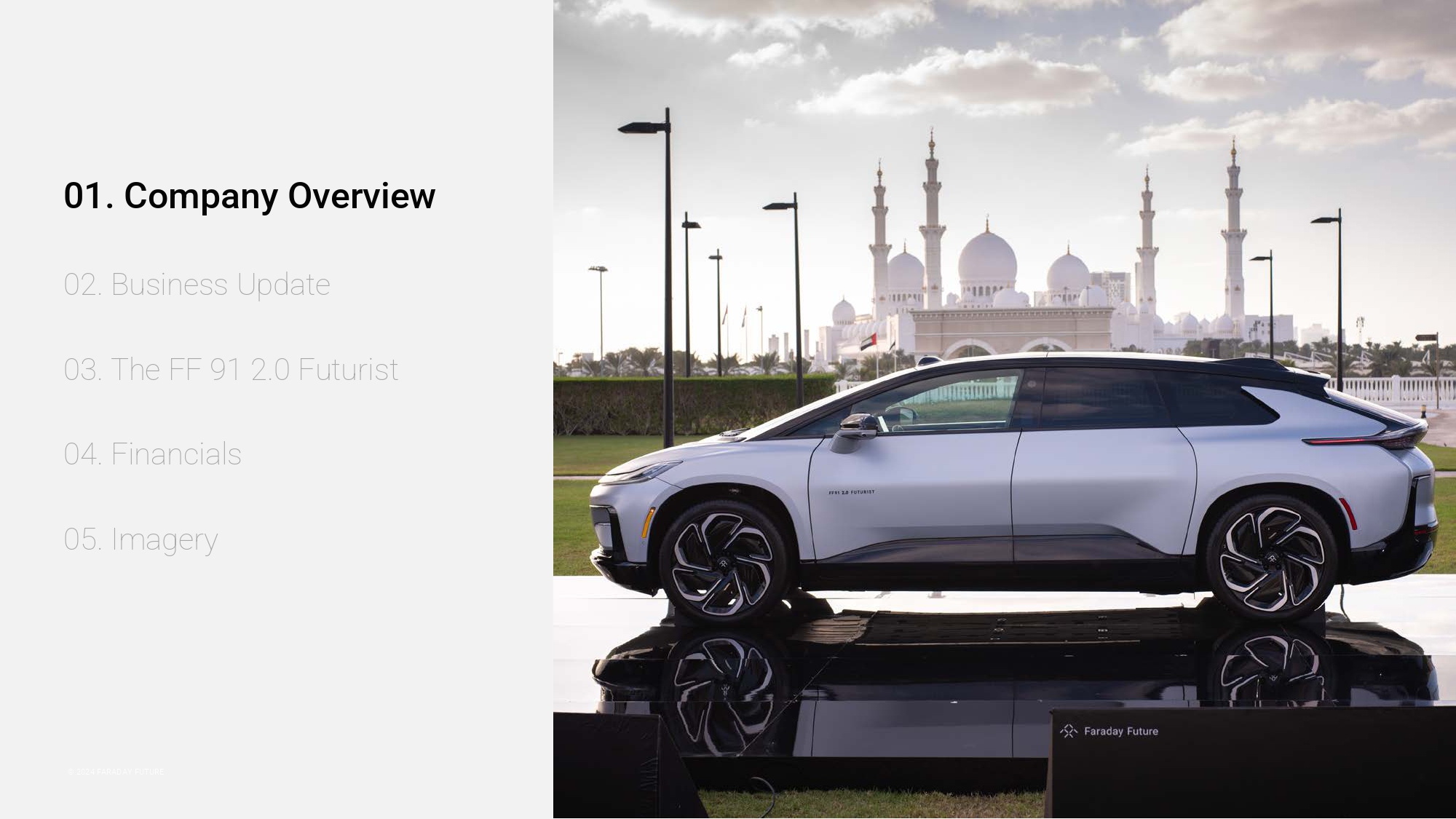 01. Company Oveíview 2. Business Update 3. The FF 91 2.0 Futuíist 4. Financials 5. ex99-2íy Table of Contents P R O P R I ET A R Y A N D C ON F ID E N TI A L 3 © 2024 FARADAY FUTURE 3 © 2024 FARADAY FUTURE PROPRIETARY AND CONFIDENTIAL
