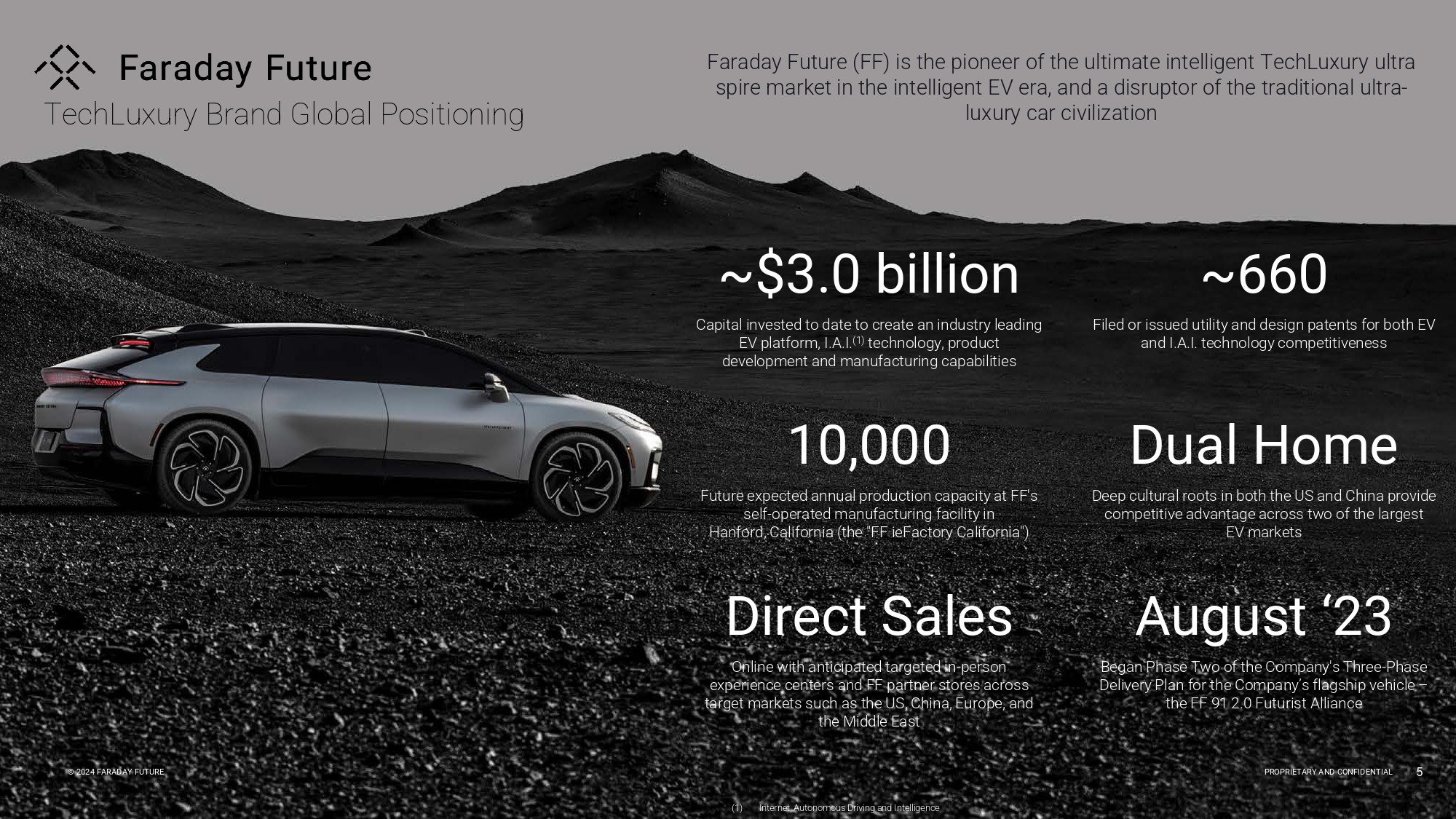 01. Company Oveíview 2. Business Updaľe 3. The ÏÏ 91 2.0 Ïuľuíisľ 4. Ïinancials 5. ex99-2íy © 2024 FARADAY FUTURE 4 © 2024 FARADAY FUTURE PROPRIETARY AND CONFIDENTIAL