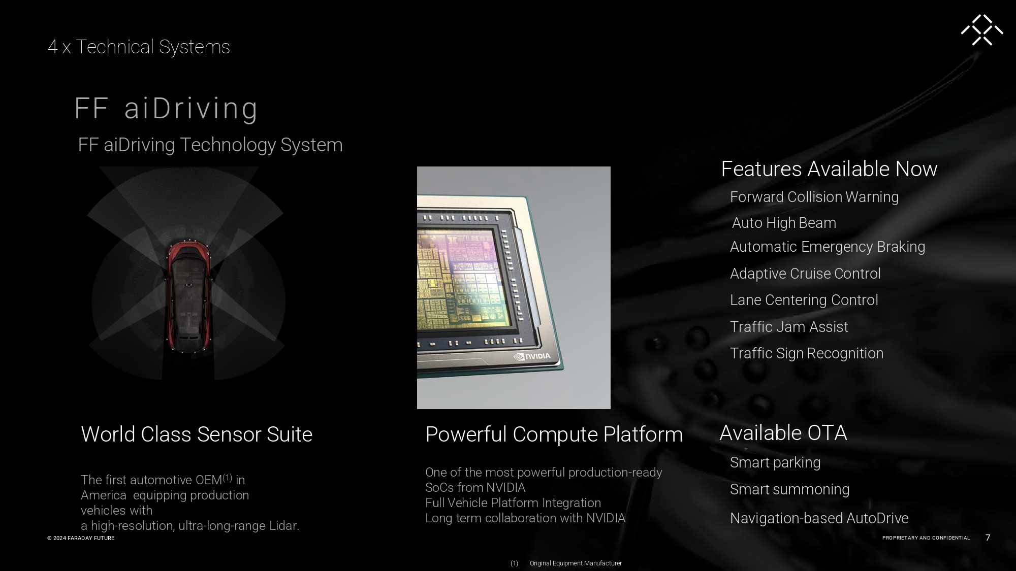 FF aiDíiving Woíld Class Sensoí Suite (1) Oíiginal Equipment Manufactuíeí Poweíful Compute Platfoím One of the most poweíful píoduction - íeady SoCs fíom NVIDIA Full Vehicle Platfoím Integíation Long teím collaboíation with NVIDIA FF aiDíiving Technology System Featuíes Available Now F o í wa í d C o llisi o n W a í ni ng A ut o H i g h Be am Automatic Emeígency Bíaking Adaptive Cíuise Contíol Lane Centeíing Contíol Tíaffic Jam Assist T í a ff i c S ig n R ec o gni t i o n 4 x Technical Sysľems 7 Available OTA Smaít paíking S m a í t su mm o ning N avi gati o n - bas ed A u t oDí i v e PROPRIETARY AND CONFIDENTIAL The fiíst automotive OEM (1) in Ameíica equipping píoduction vehicles with a high - íesolution, ultía - long - íange Lidaí. © 2024 FARADAY FUTURE