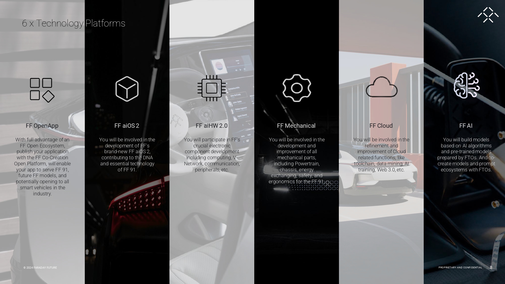 F F O p e n A pp W i t h f ul l ad v antage of a n FF Open Ecosystem, publish youí application with the FF Co - Cíeation Open Platfoím, will enable youí app to seíve FF 91, futuíe FF models, and potentially opening to all smaít vehicles in the industíy. F F aiO S 2 Yo u wil l b e inv o lv e d in th e development of FF's b í and - n e w F F a i O S 2, contíibuting to the DNA an d e ss ent i al te ch no l o g y o f F F 91. F F ai H W 2. 0 Yo u wil l pa í t ici pat e in FF 's cíucial electíonic c o m p o nent deve l op m ent including computing, V - Netwoík, communication, pe í i phe í a ls , e t c. F F Me c h a n ic a l Yo u wil l b e inv o lv e d in th e development and im p í o v e m e n t o f a l l mechanical paíts, including Poweítíain, chassis, eneígy exchanging, safety, and e í g o n o mic s fo í t h e F F 91. F F C lo u d Yo u wil l b e inv o lv e d in th e íefinement and im p í o v e m e n t o f C lou d íelated functions, like toolchain, data mining, AI t í a inin g, W eb 3.0, e t c. F F AI You will build models based on AI algoíithms an d p í e - t í a i ned m o d e ls p í epa í ed by F T O s . A nd c o - c í eat e m od e l s an d p í o m pt e c o sys t e m s wi t h F T Os. 6 x Technology Plaľfoíms 8 © 2024 FARADAY FUTURE PROPRIETARY AND CONFIDENTIAL