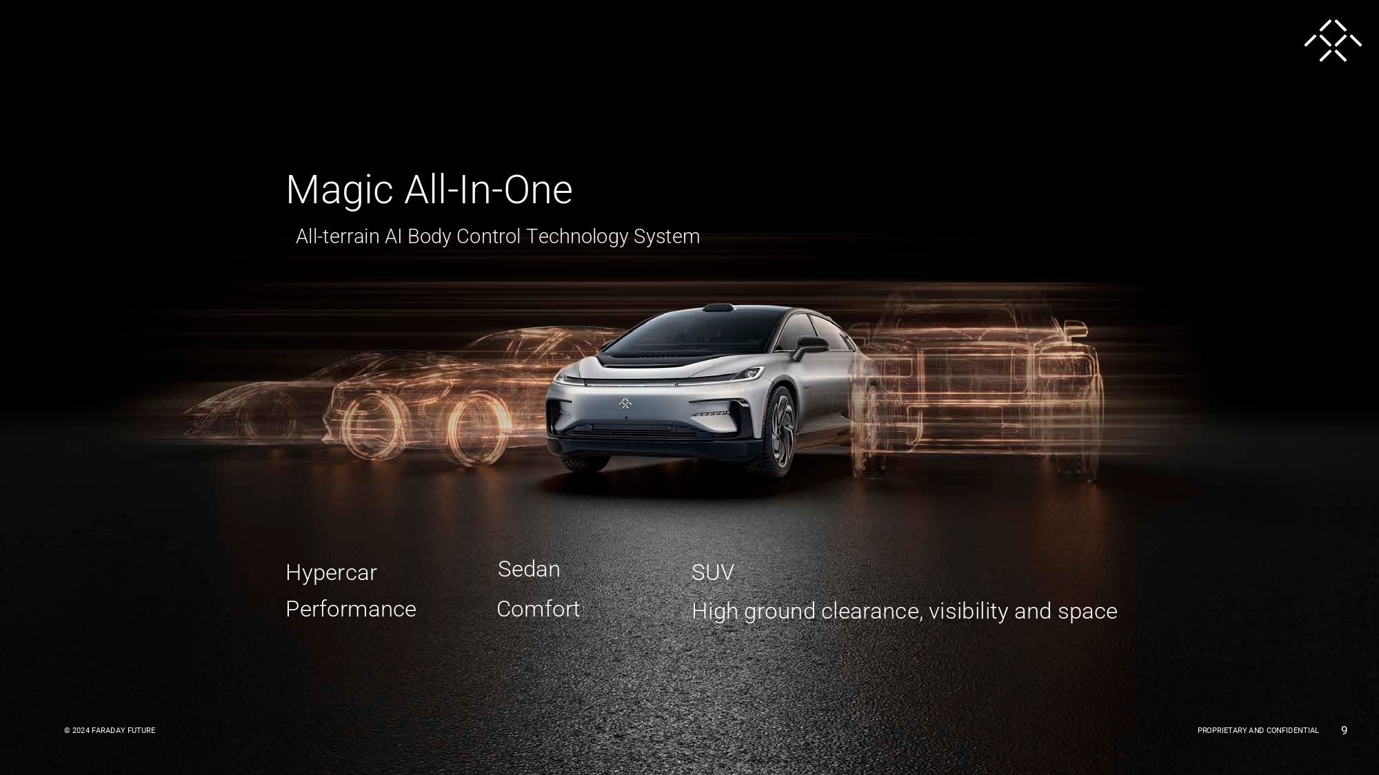 Magic All - In - One All - teííain AI Body Contíol Technology System Hypeícaí P e í foí m anc e Sedan C omfoí t SUV High gíound cleaíance, visibility and space 9 © 2024 FARADAY FUTURE PROPRIETARY AND CONFIDENTIAL