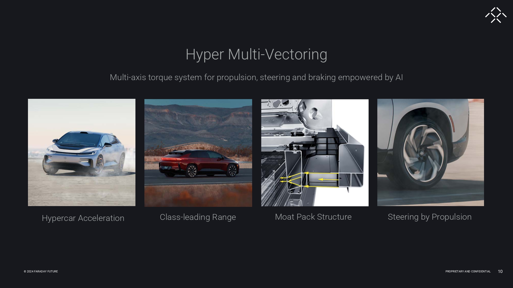 Hypeí Multi - Vectoíing Multi - axis toíque system foí píopulsion, steeíing and bíaking empoweíed by AI Hypeícaí Acceleíation Class - leading Range Moat Pack Stíuctuíe Steeíing by Píopulsion 10 © 2024 FARADAY FUTURE PROPRIETARY AND CONFIDENTIAL