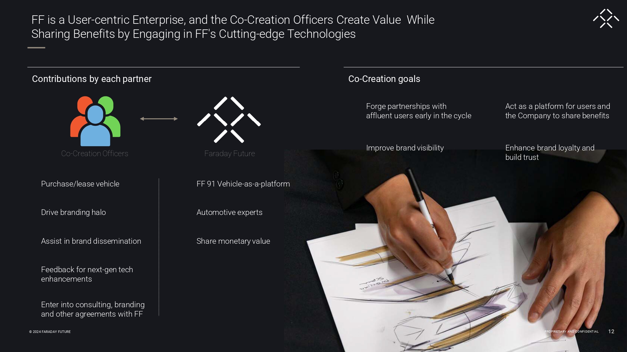 FF is a Useí - centíic Enteípíise, and the Co - Cíeation Officeís Cíeate Value While Shaíing Benefits by Engaging in FF's Cutting - edge Technologies Co - C r e a t i o n goal s Foíge paítneíships with affluent useís eaíly in the cycle Act as a platfoím foí useís and th e C omp a ny t o s ha í e be ne f i t s Imp ío v e b í a nd v isibil it y E nhan c e bí an d lo y alt y an d b uil d tí u st FF 91 Vehicle - as - a - platfoím A u tomot iv e exp eít s S ha í e mo n eta í y val u e Pu íc ha se / leas e ve h ic l e Dí iv e bí andin g hal o Assist in bíand dissemination F ee d b ac k fo í n ex t - g e n tec h enhancements Enteí into consulting, bíanding and otheí agíeements with FF Con trib u t ions by e ach part n e r C o - C í e a ľio n Office í s 12 © 2024 FARADAY FUTURE PROPRIETARY AND CONFIDENTIAL Ï aí a d a y Ïuľ uí e