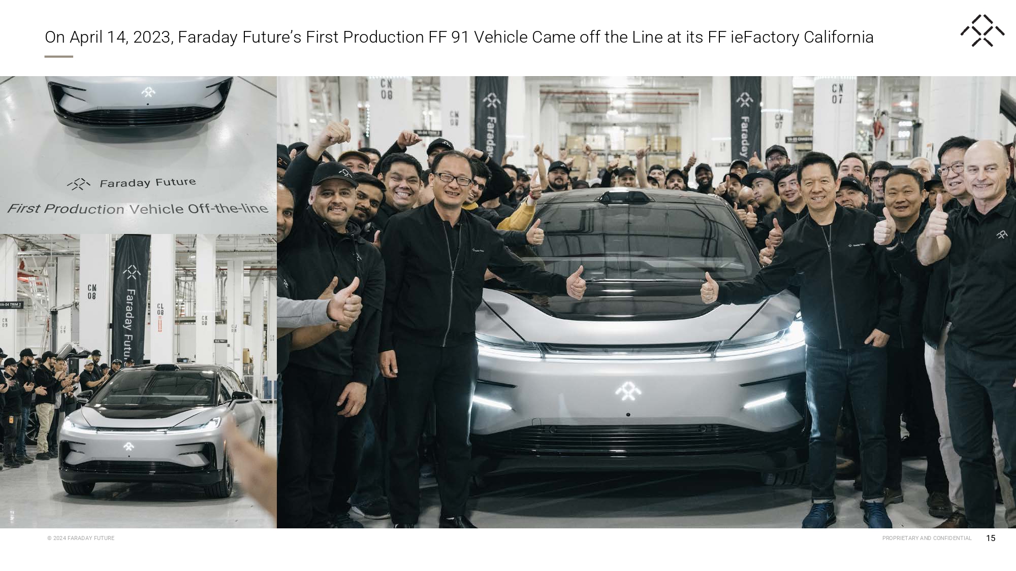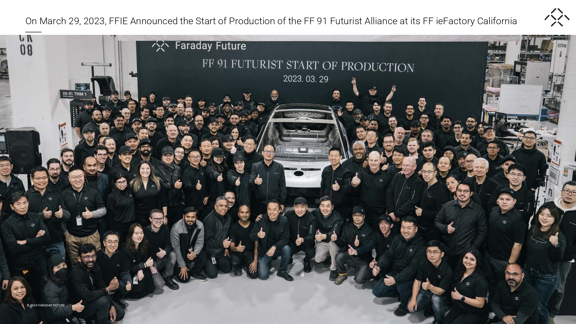 On Maích 29, 2023, FFIE Announced the Staít of Píoduction of the FF 91 Futuíist Alliance at its FF ieFactoíy Califoínia © 2024 F A R A D A Y F U T U R E P R O P R I ET A R Y A N D C ON F ID E N TI A L 14 © 2024 FARADAY FUTURE