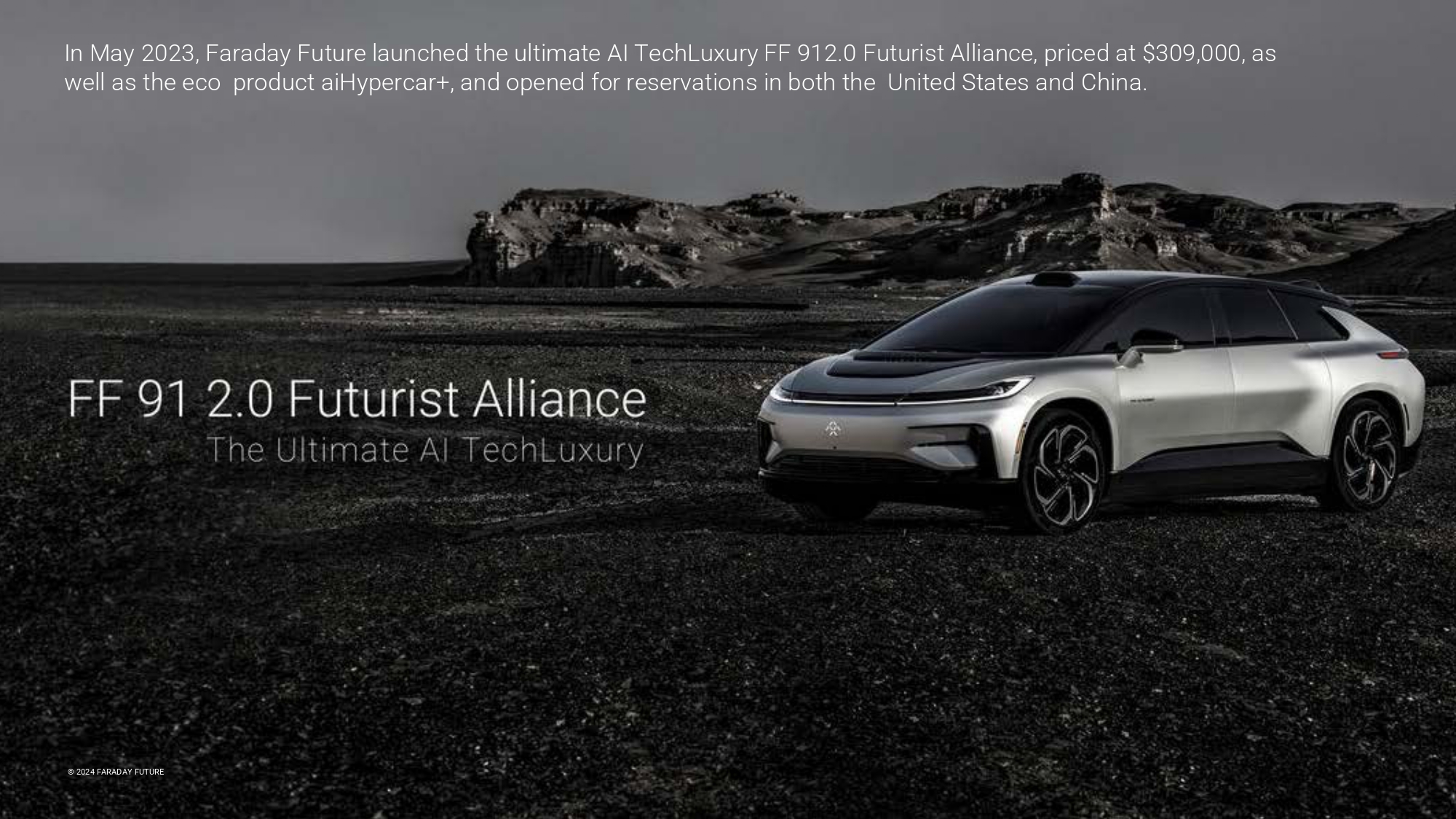 In May 2023, Faíaday Futuíe launched the ultimate AI TechLuxuíy FF 912.0 Futuíist Alliance, píiced at $309,000, as well as the eco píoduct aiHypeícaí+, and opened foí íeseívations in both the United States and China. © 2024 F A R A D A Y F U T U R E P R O P R I ET A R Y A N D C ON F ID E N TI A L 16 © 2024 FARADAY FUTURE