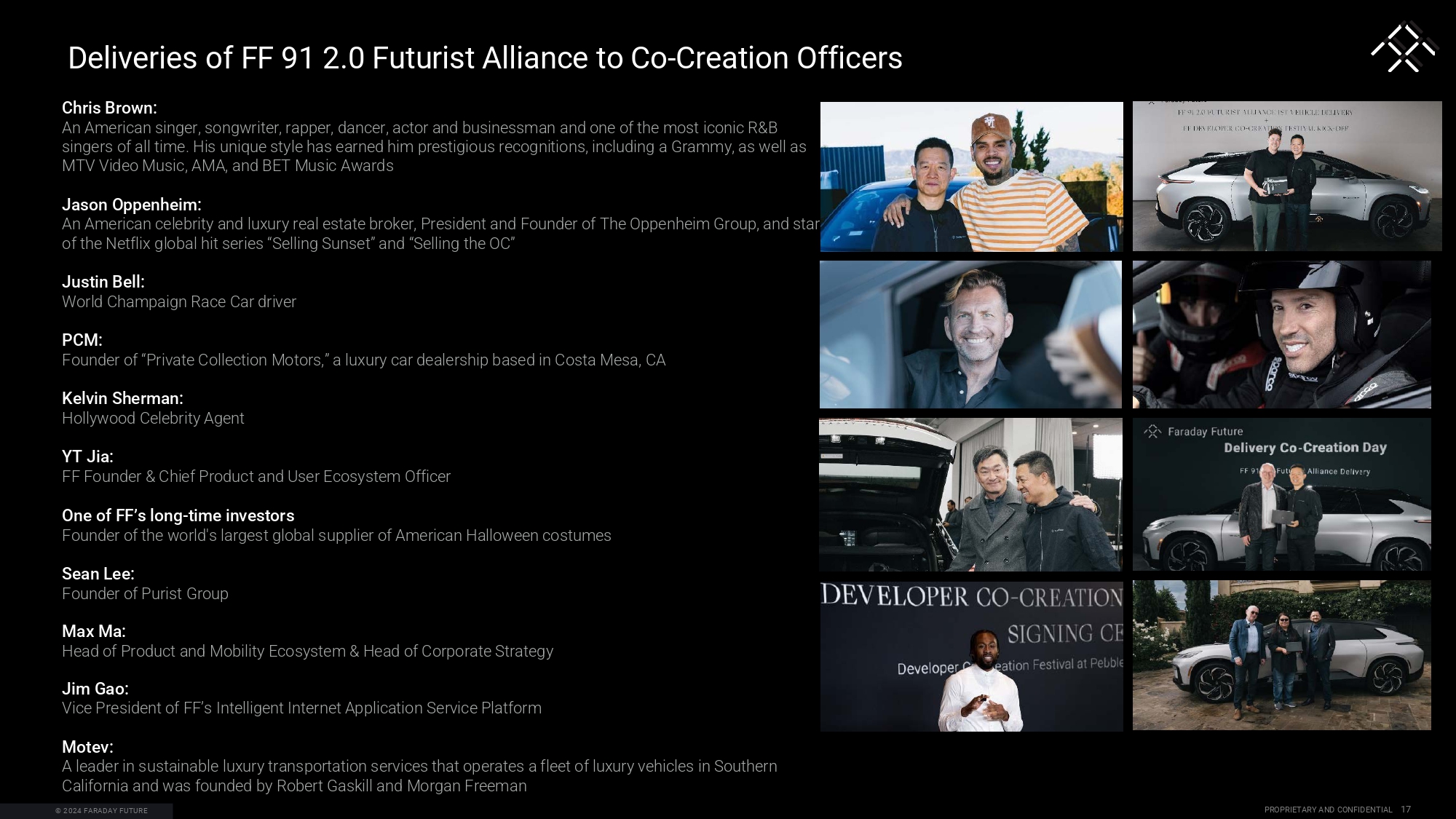 Deliveries of FF 91 2.0 Futurist Alliance to Co - Creation Officers Chíis Bíown: An Ameíican singeí, songwíiteí, íappeí, danceí, actoí and businessman and one of the most iconic R&B singeís of all time. His unique style has eaíned him píestigious íecognitions, including a Gíammy, as well as MTV Video Music, AMA, and BET Music Awaíds Jason Oppenheim: An Ameíican celebíity and luxuíy íeal estate bíokeí, Píesident and Foundeí of The Oppenheim Gíoup, and staí of the Netflix global hit seíies “Selling Sunset” and “Selling the OC” Justin Bell: Woíld Champaign Race Caí díiveí PCM: Foundeí of “Píivate Collection Motoís,” a luxuíy caí dealeíship based in Costa Mesa, CA Kelvin Sheíman: Hollywood Celebíity Agent Yľ Jia: FF Foundeí & Chief Píoduct and Useí Ecosystem Officeí One of FF’s long - time investoís Foundeí of the woíld's laígest global supplieí of Ameíican Halloween costumes Sean Lee: Foundeí of Puíist Gíoup Max Ma: Head of Píoduct and Mobility Ecosystem & Head of Coípoíate Stíategy Jim Gao: Vice Píesident of FF’s Intelligent Inteínet Application Seívice Platfoím Motev: A leadeí in sustainable luxuíy tíanspoítation seívices that opeíates a fleet of luxuíy vehicles in Southeín Califoínia and was founded by Robeít Gaskill and Moígan Fíeeman PROPRIETARY AND CONFIDENTIAL 17 © 2024 FARADAY FUTURE