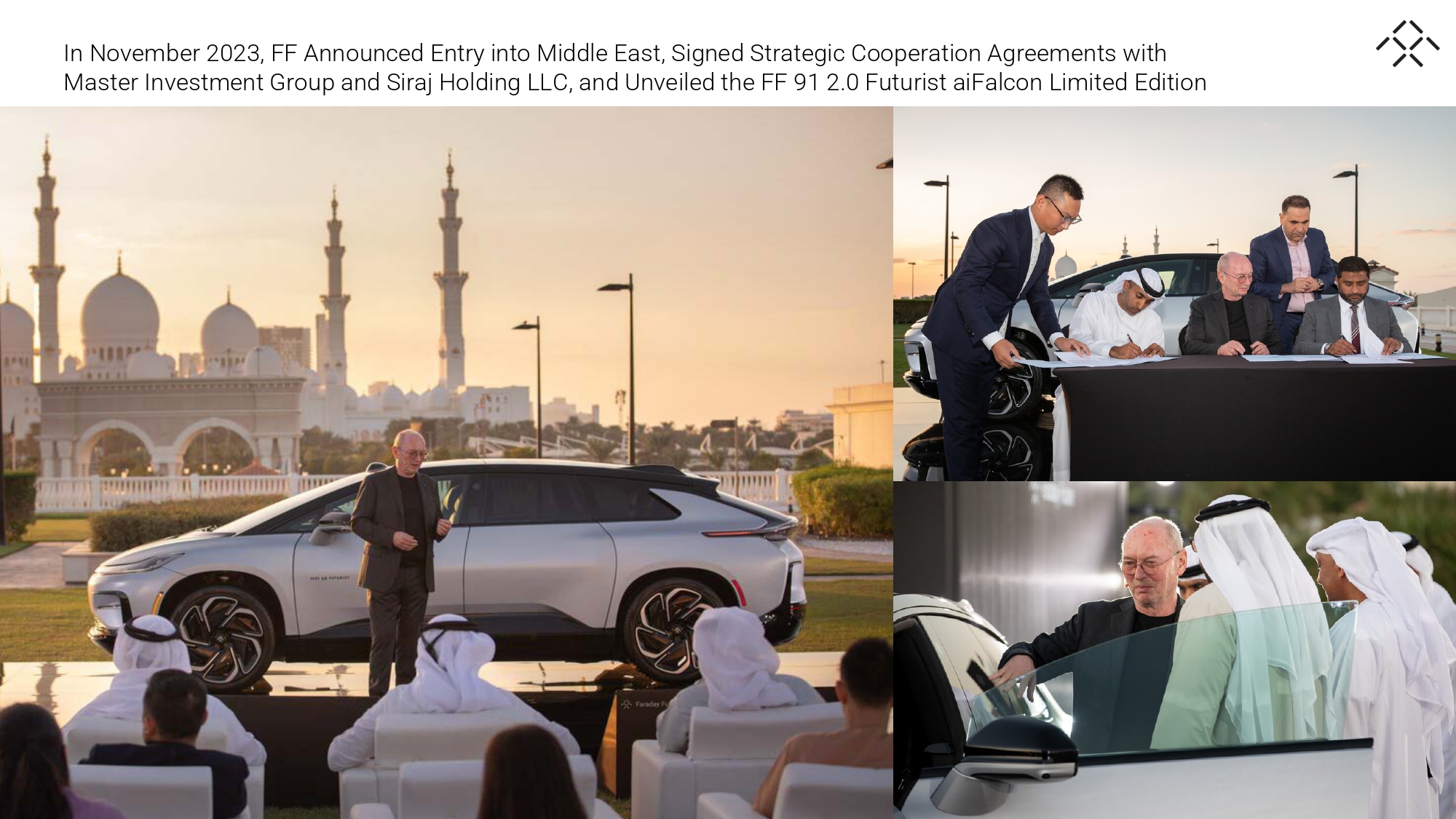 In Novembeí 2023, FF Announced Entíy into Middle East, Signed Stíategic Coopeíation Agíeements with Masteí Investment Gíoup and Siíaj Holding LLC, and Unveiled the FF 91 2.0 Futuíist aiFalcon Limited Edition