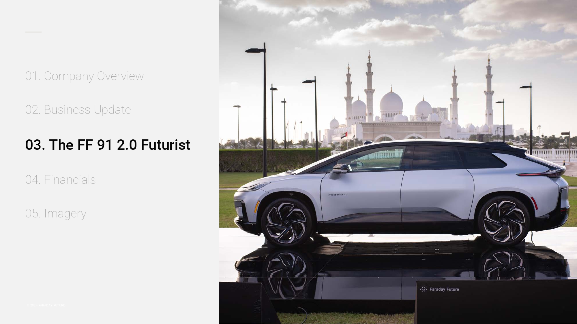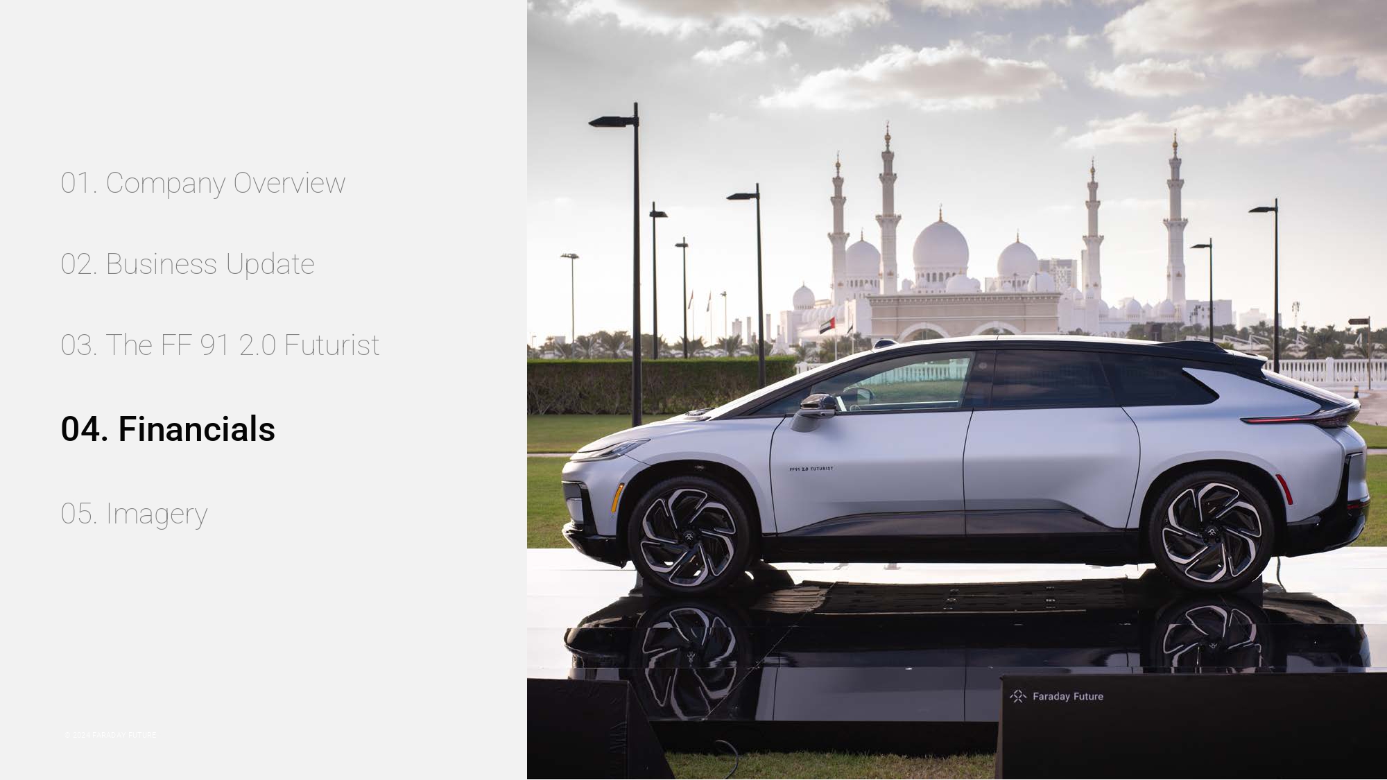 01. Company Oveíview 2. Business Updaľe 3. The ÏÏ 91 2.0 Ïuľuíisľ 4. Financials 5. ex99-2íy © 2024 FARADAY FUTURE 23 © 2024 FARADAY FUTURE PROPRIETARY AND CONFIDENTIAL