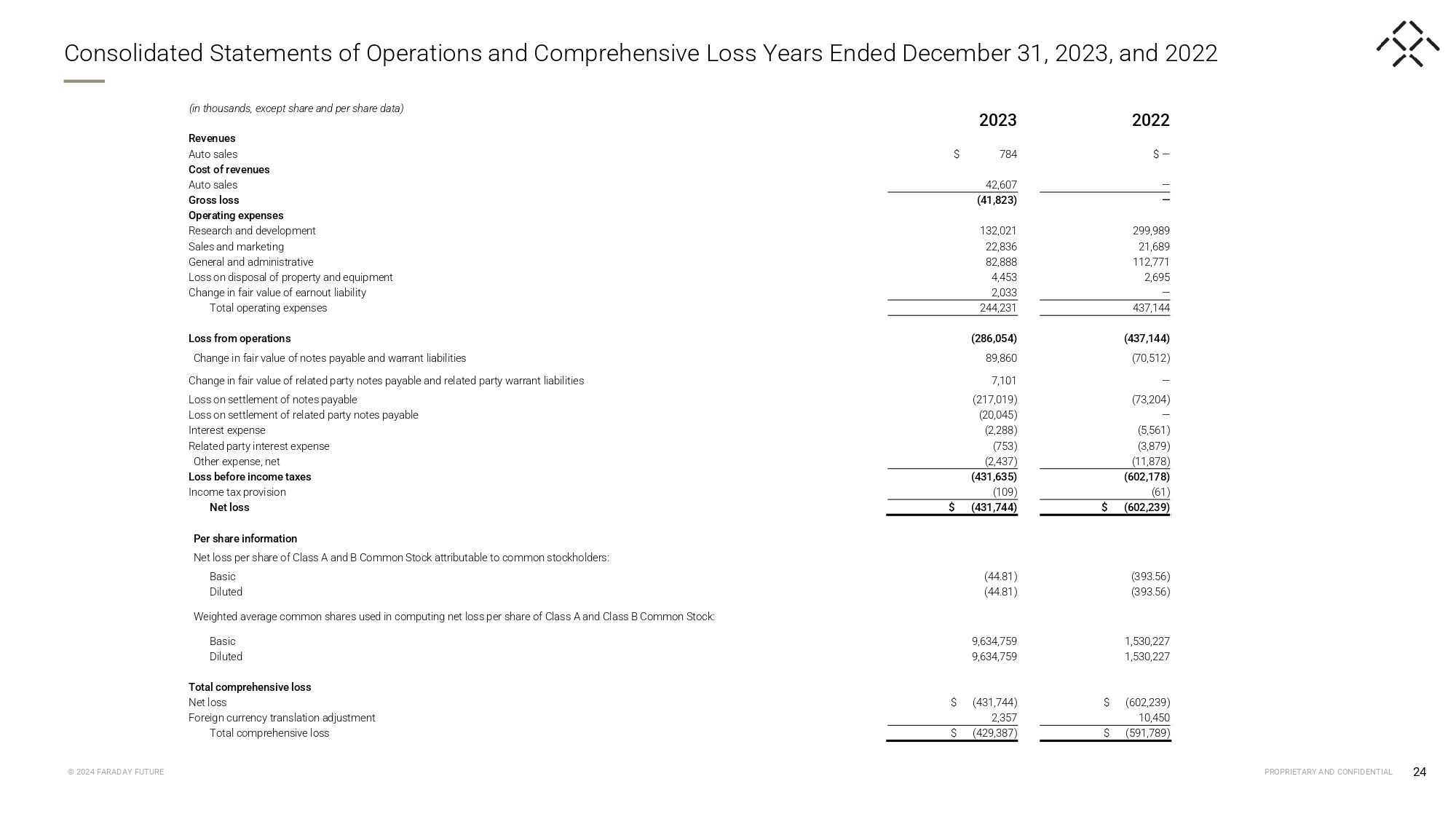 Consolidated Statements of Opeíations and Compíehensive Loss Yeaís Ended Decembeí 31, 2023, and 2022 24 © 2024 FARADAY FUTURE PROPRIETARY AND CONFIDENTIAL 2022 2023 Revenues $ — $ 784 Auto sales Cost of íevenues — 42,607 Auto sales — (41,823) Gíoss loss Opeíating expenses 299,989 132,021 Reseaích and development 21,689 22,836 Sales and maíketing 112,771 82,888 Geneíal and administíative 2,695 4,453 Loss on disposal of píopeíty and equipment — 2,033 Change in faií value of eaínout liability 437,144 244,231 Total opeíating expenses (437,144) (286,054) Loss fíom opeíations (70,512) 89,860 Change in faií value of notes payable and waííant liabilities — 7,101 Change in faií value of íelated paíty notes payable and íelated paíty waííant liabilities (73,204) (217,019) Loss on settlement of notes payable — (20,045) Loss on settlement of íelated paíty notes payable (5,561) (2,288) Inteíest expense (3,879) (753) Related paíty inteíest expense (11,878) (2,437) Otheí expense, net (602,178) (431,635) Loss befoíe income taxes (61) (109) Income tax píovision $ (602,239) $ (431,744) Net loss Peí shaíe infoímation Net loss peí shaíe of Class A and B Common Stock attíibutable to common stockholdeís: (393.56) (44.81) Basic (393.56) (44.81) Diluted Weighted aveíage common shaíes used in computing net loss peí shaíe of Class A and Class B Common Stock: 1,530,227 9,634,759 Basic 1,530,227 9,634,759 Diluted ľotal compíehensive loss $ (602,239) $ (431,744) Net loss 10,450 2,357 Foíeign cuííency tíanslation adjustment $ (591,789) $ (429,387) Total compíehensive loss (in īhousands, excepī shaĩe and peĩ shaĩe daīa)