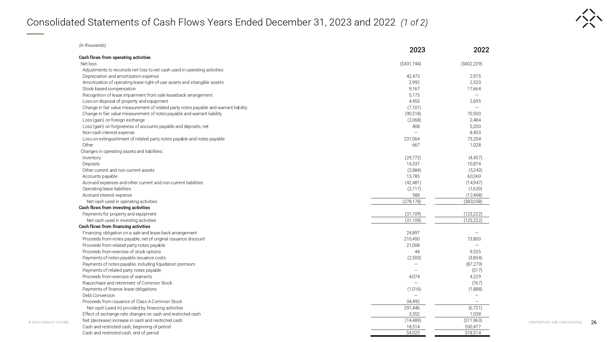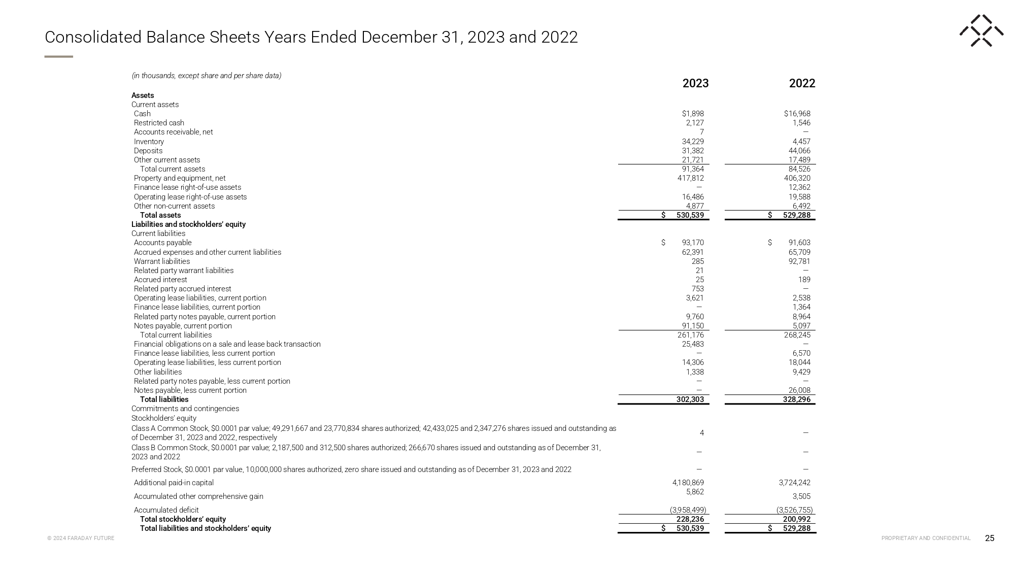 Consolidated Balance Sheets Yeaís Ended Decembeí 31, 2023 and 2022 25 © 2024 FARADAY FUTURE PROPRIETARY AND CONFIDENTIAL 2022 2023 Assets Cuííent assets $16,968 $1,898 Cash 1,546 2,127 Restíicted cash — 7 Accounts íeceivable, net 4,457 34,229 Inventoíy 44,066 31,382 Deposits 17,489 21,721 Otheí cuííent assets 84,526 91,364 Total cuííent assets 406,320 417,812 Píopeíty and equipment, net 12,362 — Finance lease íight - of - use assets 19,588 16,486 Opeíating lease íight - of - use assets 6,492 4,877 Otheí non - cuííent assets $ 529,288 $ 530,539 ľotal assets Liabilities and stockholdeís’ equity Cuííent liabilities $ 91,603 $ 93,170 Accounts payable 65,709 62,391 Accíued expenses and otheí cuííent liabilities 92,781 285 Waííant liabilities — 21 Related paíty waííant liabilities 189 25 Accíued inteíest — 753 Related paíty accíued inteíest 2,538 3,621 Opeíating lease liabilities, cuííent poítion 1,364 — Finance lease liabilities, cuííent poítion 8,964 9,760 Related paíty notes payable, cuííent poítion 5,097 91,150 Notes payable, cuííent poítion 268,245 261,176 Total cuííent liabilities — 25,483 Financial obligations on a sale and lease back tíansaction 6,570 — Finance lease liabilities, less cuííent poítion 18,044 14,306 Opeíating lease liabilities, less cuííent poítion 9,429 1,338 Otheí liabilities — — Related paíty notes payable, less cuííent poítion 26,008 — Notes payable, less cuííent poítion 328,296 302,303 ľotal liabilities Commitments and contingencies S to ckh o l de ís ’ e qui ty — 4 Class A Common Stock, $0.0001 paí value; 49,291,667 and 23,770,834 shaíes authoíized; 42,433,025 and 2,347,276 shaíes issued and outstanding as of Decembeí 31, 2023 and 2022, íespectively — — Class B Common Stock, $0.0001 paí value; 2,187,500 and 312,500 shaíes authoíized; 266,670 shaíes issued and outstanding as of Decembeí 31, 2023 and 2022 — — Píefeííed Stock, $0.0001 paí value, 10,000,000 shaíes authoíized, zeío shaíe issued and outstanding as of Decembeí 31, 2023 and 2022 3,724,242 4,180,869 Additional paid - in capital 3,505 5,862 Accumulated otheí compíehensive gain (3,526,755) (3,958,499) Accumulated deficit 200,992 228,236 ľotal stockholdeís’ equity $ 529,288 $ 530,539 ľotal liabilities and stockholdeís’ equity (in īhousands, excepī shaĩe and peĩ shaĩe daīa)