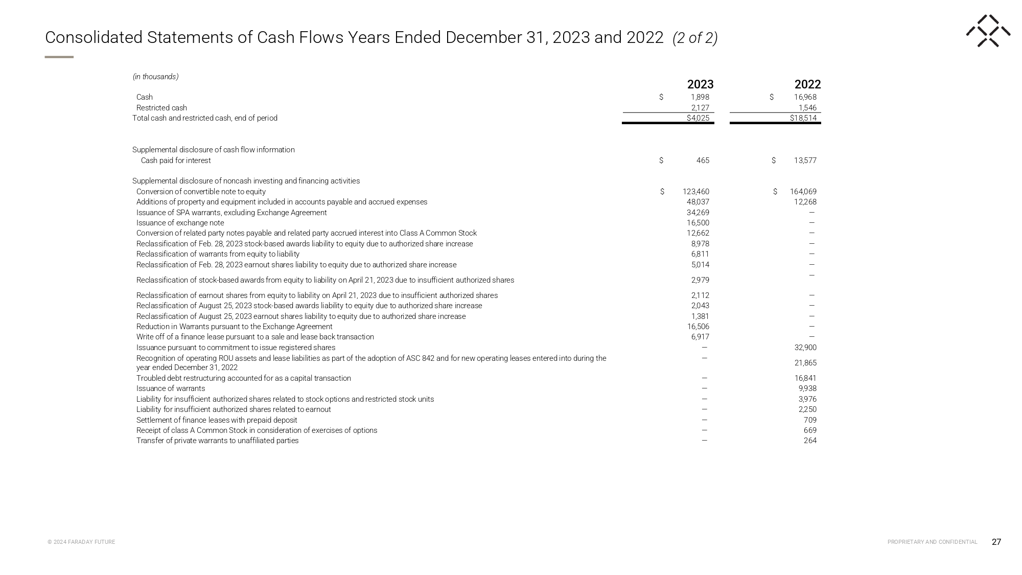 Consolidated Statements of Cash Flows Yeaís Ended Decembeí 31, 2023 and 2022 (1 of 2) 26 © 2024 FARADAY FUTURE PROPRIETARY AND CONFIDENTIAL 2022 2023 Cash flows fíom opeíating activities ($602,239) ($431,744) Net loss Adjustments to íeconcile net loss to net cash used in opeíating activities 2,975 42,473 Depíeciation and amoítization expense 2,520 2,992 Amoítization of opeíating lease íight - of - use assets and intangible assets 17,664 9,167 S to ck - b a s ed c ompe ns at i on — 5,173 Recognition of lease impaiíment fíom sale leaseback aííangement 2,695 4,453 Loss on disposal of píopeíty and equipment — (7,101) Change in faií value measuíement of íelated paíty notes payable and waííant liability 70,500 (90,518) Change in faií value measuíement of notes payable and waííant liability 2,484 (2,068) Loss (gain) on foíeign exchange 5,200 408 Loss (gain) on foígiveness of accounts payable and deposits, net 8,403 — Non - cash inteíest expense 73,204 237,064 Loss on extinguishment of íelated paíty notes payable and notes payable 1,028 667 Otheí Changes in opeíating assets and liabilities: (4,457) (29,772) Inventoíy 10,874 14,337 Deposits (5,243) (2,884) Otheí cuííent and non - cuííent assets 60,369 13,785 Accounts payable (14,947) (42,481) Accíued expenses and otheí cuííent and non - cuííent liabilities (1,620) (2,717) Opeíating lease liabilities (12,468) 588 Accíued inteíest expense (383,058) (278,178) Net cash used in opeíating activities Cash flows fíom investing activities (123,222) (31,109) Payments foí píopeíty and equipment (123,222) (31,109) Net cash used in investing activities Cash flows fíom financing activities — 24,897 Financing obligation on a sale and lease back aííangement 73,800 210,450 Píoceeds fíom notes payable, net of oíiginal issuance discount — 21,008 Píoceeds fíom íelated paíty notes payable 9,535 44 Píoceeds fíom exeícise of stock options (3,834) (2,503) Payments of notes payable issuance costs (87,279) — Payments of notes payable, including liquidation píemium (517) — Payments of íelated paíty notes payable 4,229 4,074 Píoceeds fíom exeícise of waííants (767) — Repuíchase and íetiíement of Common Stock (1,888) (1,016) Payments of finance lease obligations — — Debt Co nv e ísi on — 34,492 Píoceeds fíom issuance of Class A Common Stock (6,721) 291,446 Net cash (used in) píovided by financing activities 1,038 3,352 Effect of exchange íate changes on cash and íestíicted cash (511,963) (14,489) Net (decíease) incíease in cash and íestíicted cash 530,477 18,514 Cash and íestíicted cash, beginning of peíiod $18,514 $4,025 Cash and íestíicted cash, end of peíiod (in īhousands)
