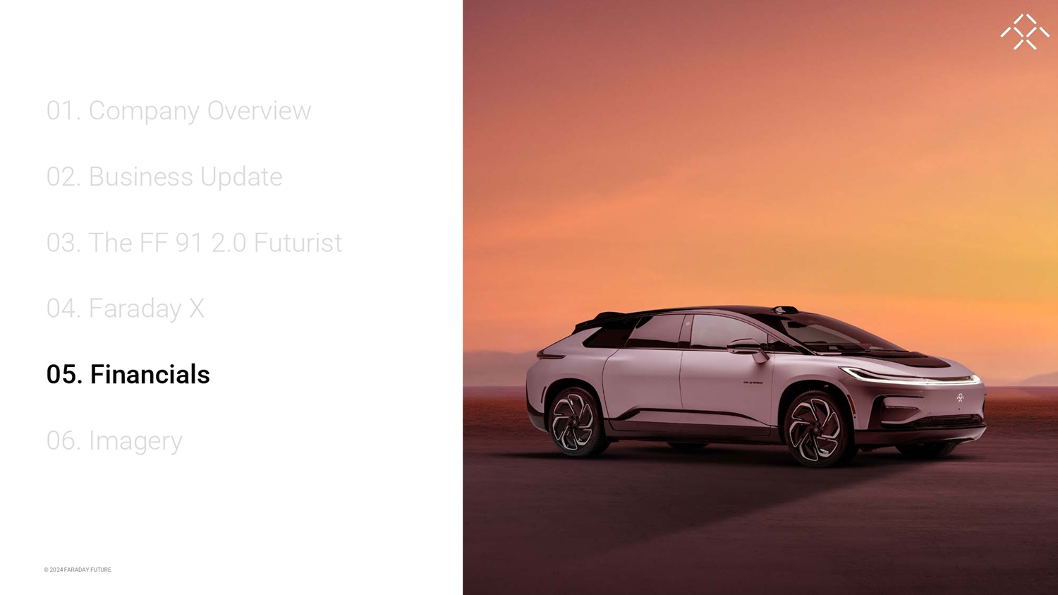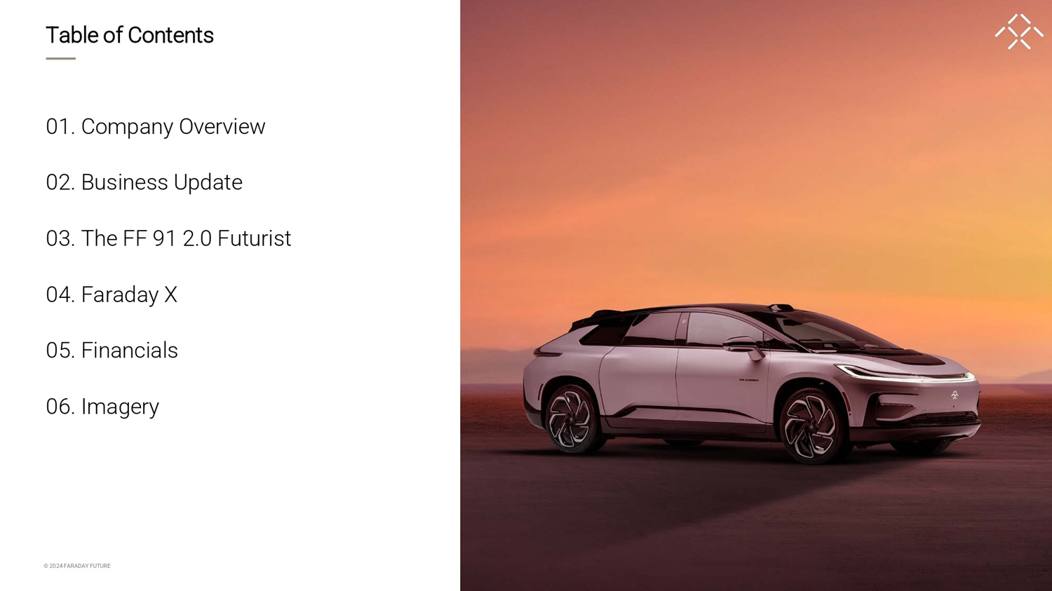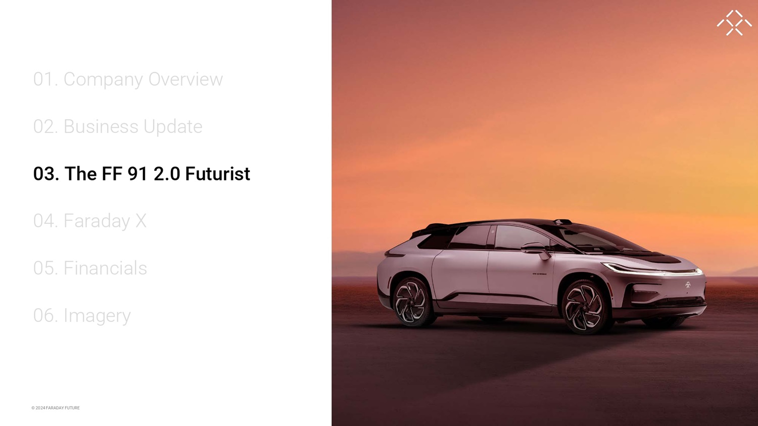 © 202 4 F A R A D A Y FU ľ U R E PROPRIEľARY AND CONFIDENľIAL 01. Company Oveíview 2. Business Update 3. The FF 91 2.0 Futuíist 4. Faíaday X 5. Financials 6. Imageíy