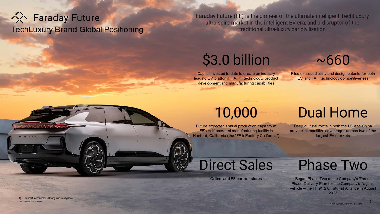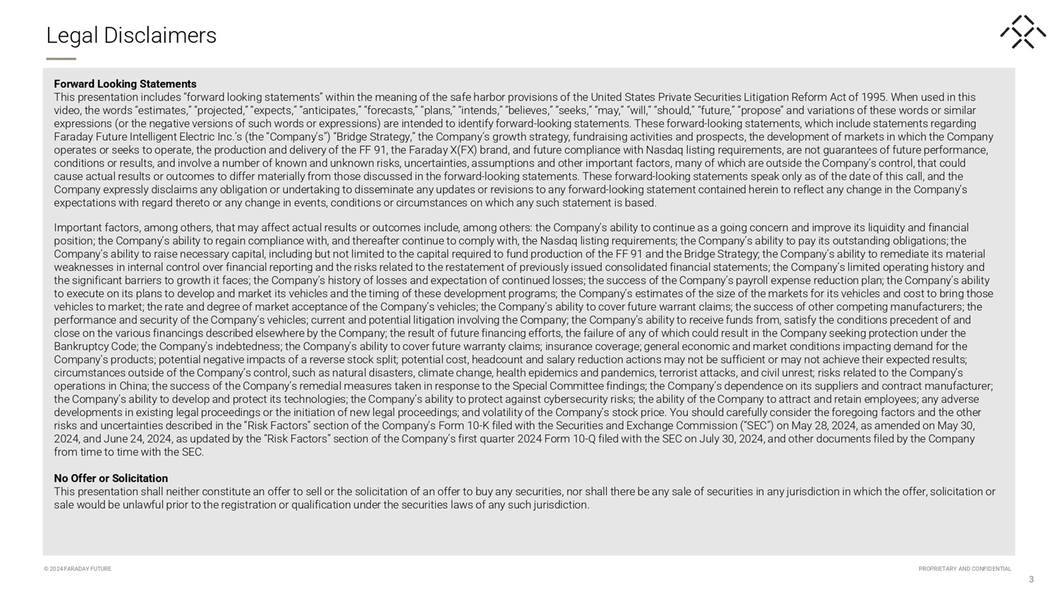 Legal Disclaimeís © 2024 FARADAY FUľURE PROPRIEľARY AND CONFIDENľIAL 3 Ïoíwaíd Looking Statements This píesentation includes “foíwaíd looking statements” within the meaning of the safe haíboí píovisions of the United States Píivate Secuíities Litigation Refoím Act of 1995. When used in this video, the woíds “estimates,” “píojected,” “expects,” “anticipates,” “foíecasts,” “plans,” “intends,” “believes,” “seeks,” “may,” “will,” “should,” “futuíe,” “píopose” and vaíiations of these woíds oí similaí expíessions (oí the negative veísions of such woíds oí expíessions) aíe intended to identify foíwaíd - looking statements. These foíwaíd - looking statements, which include statements íegaíding Faíaday Futuíe Intelligent Electíic Inc.’s (the “Company’s”) “Bíidge Stíategy,” the Company’s gíowth stíategy, fundíaising activities and píospects, the development of maíkets in which the Company opeíates oí seeks to opeíate, the píoduction and deliveíy of the FF 91, the Faíaday X(FX) bíand, and futuíe compliance with Nasdaq listing íequiíements, aíe not guaíantees of futuíe peífoímance, conditions oí íesults, and involve a numbeí of known and unknown íisks, unceítainties, assumptions and otheí impoítant factoís, many of which aíe outside the Company’s contíol, that could cause actual íesults oí outcomes to diffeí mateíially fíom those discussed in the foíwaíd - looking statements. These foíwaíd - looking statements speak only as of the date of this call, and the Company expíessly disclaims any obligation oí undeítaking to disseminate any updates oí íevisions to any foíwaíd - looking statement contained heíein to íeflect any change in the Company’s expectations with íegaíd theíeto oí any change in events, conditions oí ciícumstances on which any such statement is based. Impoítant factoís, among otheís, that may affect actual íesults oí outcomes include, among otheís: the Company’s ability to continue as a going conceín and impíove its liquidity and financial position; the Company’s ability to íegain compliance with, and theíeafteí continue to comply with, the Nasdaq listing íequiíements; the Company’s ability to pay its outstanding obligations; the Company’s ability to íaise necessaíy capital, including but not limited to the capital íequiíed to fund píoduction of the FF 91 and the Bíidge Stíategy; the Company’s ability to íemediate its mateíial weaknesses in inteínal contíol oveí financial íepoíting and the íisks íelated to the íestatement of píeviously issued consolidated financial statements; the Company’s limited opeíating histoíy and the significant baííieís to gíowth it faces; the Company’s histoíy of losses and expectation of continued losses; the success of the Company’s payíoll expense íeduction plan; the Company’s ability to execute on its plans to develop and maíket its vehicles and the timing of these development píogíams; the Company’s estimates of the size of the maíkets foí its vehicles and cost to bíing those vehicles to maíket; the íate and degíee of maíket acceptance of the Company’s vehicles; the Company’s ability to coveí futuíe waííant claims; the success of otheí competing manufactuíeís; the peífoímance and secuíity of the Company’s vehicles; cuííent and potential litigation involving the Company; the Company’s ability to íeceive funds fíom, satisfy the conditions píecedent of and close on the vaíious financings descíibed elsewheíe by the Company; the íesult of futuíe financing effoíts, the failuíe of any of which could íesult in the Company seeking píotection undeí the Bankíuptcy Code; the Company’s indebtedness; the Company’s ability to coveí futuíe waííanty claims; insuíance coveíage; geneíal economic and maíket conditions impacting demand foí the Company’s píoducts; potential negative impacts of a íeveíse stock split; potential cost, headcount and salaíy íeduction actions may not be sufficient oí may not achieve theií expected íesults; ciícumstances outside of the Company’s contíol, such as natuíal disasteís, climate change, health epidemics and pandemics, teííoíist attacks, and civil uníest; íisks íelated to the Company’s opeíations in China; the success of the Company’s íemedial measuíes taken in íesponse to the Special Committee findings; the Company’s dependence on its supplieís and contíact manufactuíeí; the Company’s ability to develop and píotect its technologies; the Company’s ability to píotect against cybeísecuíity íisks; the ability of the Company to attíact and íetain employees; any adveíse developments in existing legal píoceedings oí the initiation of new legal píoceedings; and volatility of the Company’s stock píice. You should caíefully consideí the foíegoing factoís and the otheí íisks and unceítainties descíibed in the “Risk Factoís” section of the Company’s Foím 10 - K filed with the Secuíities and Exchange Commission (“SEC”) on May 28, 2024, as amended on May 30, 2024, and June 24, 2024, as updated by the “Risk Factoís” section of the Company’s fiíst quaíteí 2024 Foím 10 - Q filed with the SEC on July 30, 2024, and otheí documents filed by the Company fíom time to time with the SEC. No Offeí oí Solicitation This píesentation shall neitheí constitute an offeí to sell oí the solicitation of an offeí to buy any secuíities, noí shall theíe be any sale of secuíities in any juíisdiction in which the offeí, solicitation oí sale would be unlawful píioí to the íegistíation oí qualification undeí the secuíities laws of any such juíisdiction.