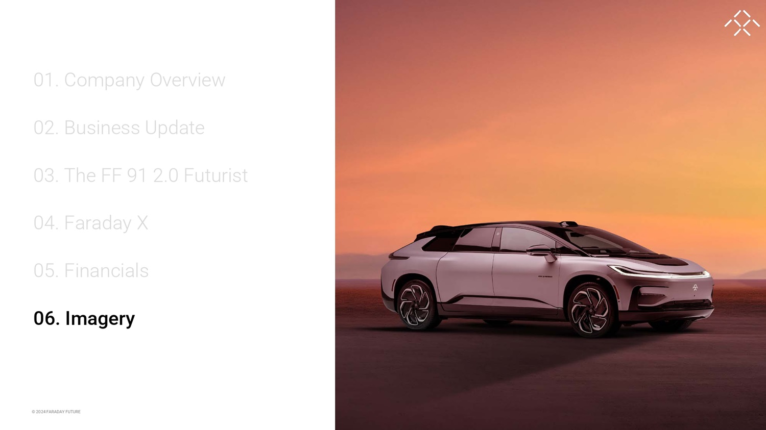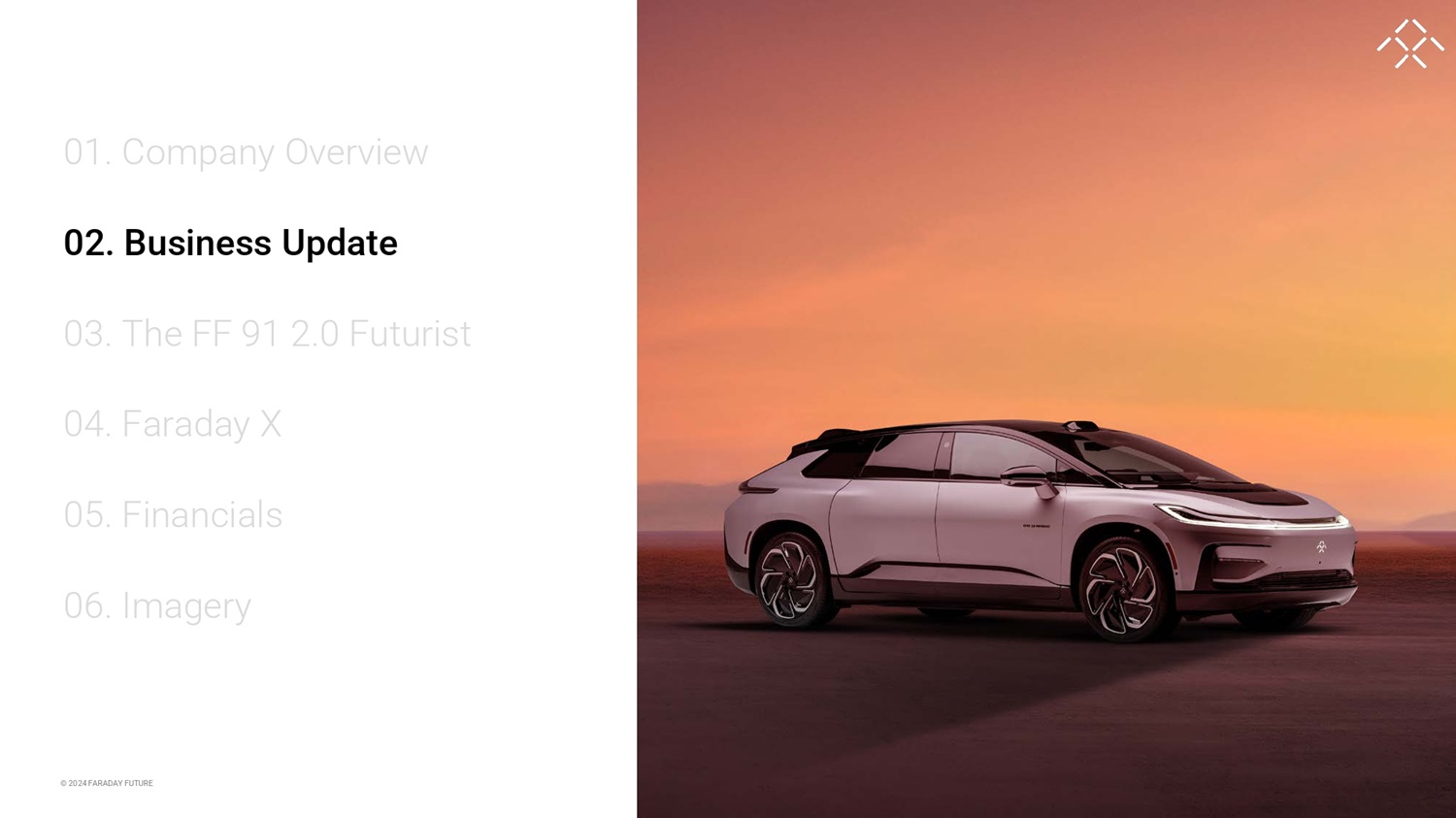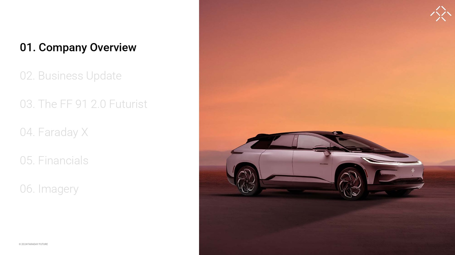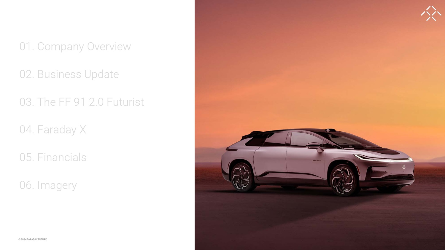 © 202 4 F A R A D A Y FU ľ U R E PROPRIEľARY AND CONFIDENľIAL 01. Company Oveíview 2. Business Update 3. ľhe FF 91 2.0 Futuíist 4. Faíaday X 5. Financials 6. Imageíy
