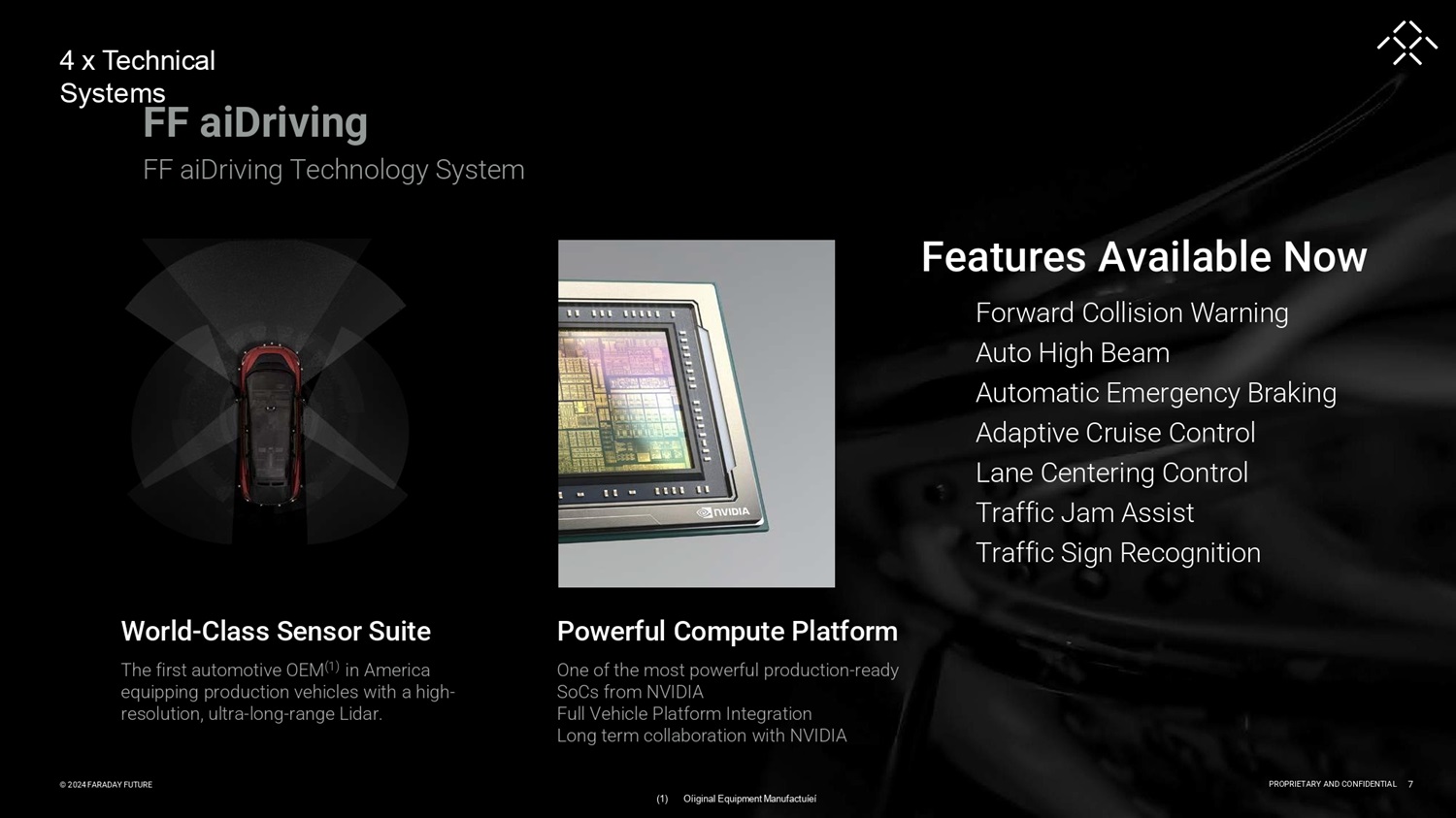 © 2024 FARADAY FUľURE PROPRIEľARY AND CONFIDENľIAL 4 x Technical Systems (1) Oíiginal Equipment Manufactuíeí PROPRIEľARY AND CONFIDENľIAL 7 © 2024 FARADAY FUľURE Featuíes Available Now Foíwaíd Collision Waíning Auto High Beam Automatic Emeígency Bíaking Adaptive Cíuise Contíol Lane Centeíing Contíol Tíaffic Jam Assist Tíaffic Sign Recognition Woíld - Class Sensoí Suite The fiíst automotive OEM (1) in Ameíica equipping píoduction vehicles with a high - íesolution, ultía - long - íange Lidaí. Poweíful Compute Platfoím One of the most poweíful píoduction - íeady SoCs fíom NVIDIA Full Vehicle Platfoím Integíation Long teím collaboíation with NVIDIA ÏÏ aiDíiving FF aiDíiving Technology System