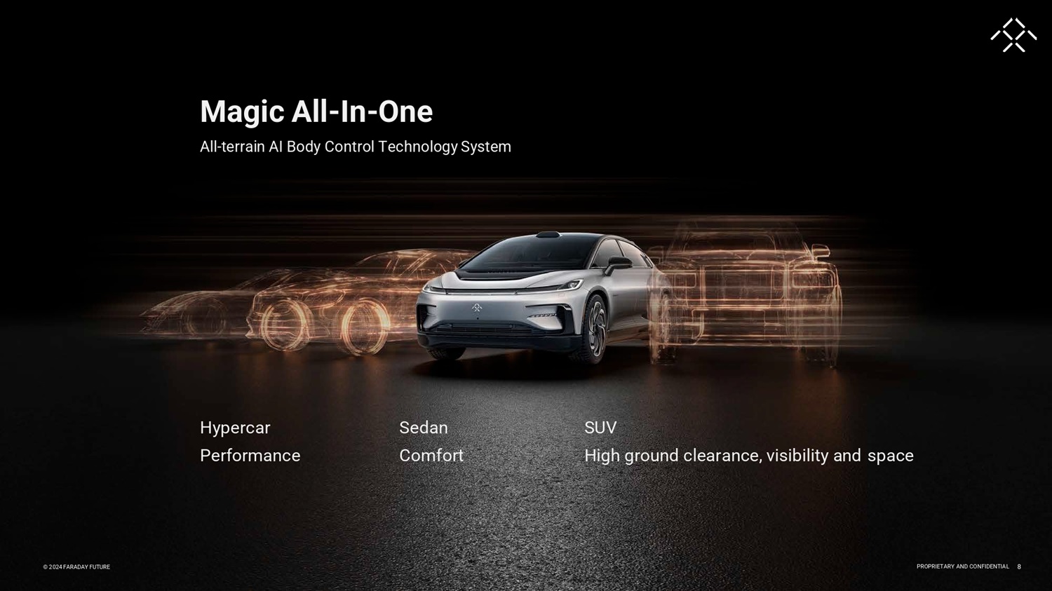 Magic All - In - One All - teííain AI Body Contíol ľechnology System Hypeícaí P e í f o í m an c e SUV High gíound cleaíance, visibility and space Sedan C om f o í t PROPRIEľARY AND CONFIDENľIAL 8 © 2024 FARADAY FUľURE