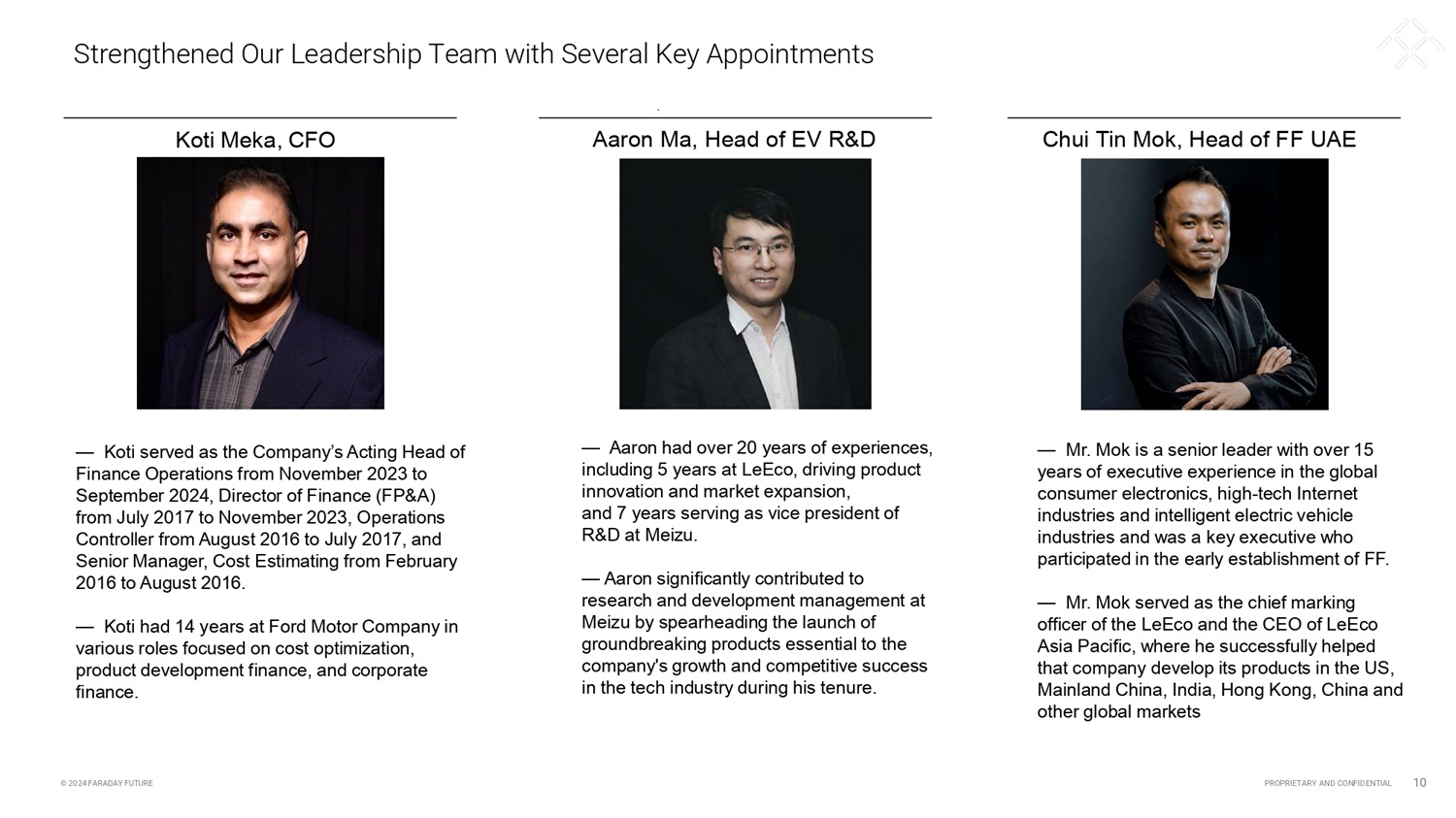 Chui Tim Mok, Head of FF UAE Koti Meka, CFO Aaron Ma, Head of EV R&D Stíengthened Ouí Leadeíship Team with Seveíal Key Appointments — Aaron had over 20 years of experiences, including 5 years at LeEco, driving product innovation and market expansion, and 7 years serving as vice president of R&D at Meizu. — Aaron significantly contributed to research and development management at Meizu by spearheading the launch of groundbreaking products essential to the company's growth and competitive success in the tech industry during his tenure. — Mr. Mok is a senior leader with over 15 years of executive experience in the global consumer electronics, high - tech Internet industries and intelligent electric vehicle industries and was a key executive who participated in the early establishment of FF. — Mr. Mok served as the chief marking officer of the LeEco and the CEO of LeEco Asia Pacific, where he successfully helped that company develop its products in the US, Mainland China, India, Hong Kong, China and other global markets — Koti served as the Company’s Acting Head of Finance Operations from November 2023 to September 2024, Director of Finance (FP&A) from July 2017 to November 2023, Operations Controller from August 2016 to July 2017, and Senior Manager, Cost Estimating from February 2016 to August 2016. — Koti had 14 years at Ford Motor Company in various roles focused on cost optimization, product development finance, and corporate finance. PROPRIEľARY AND CONFIDENľIAL 10 © 2024 FARADAY FUľURE