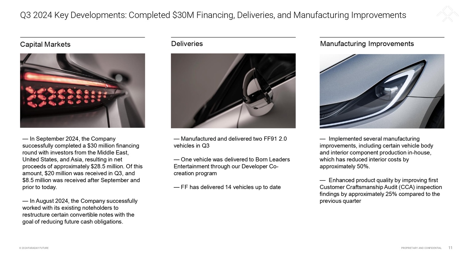 Manufacturing Improvements C ap i ta l M ar ket s Deliveries Q3 2024 Key Developments: Completed $30M Financing, Deliveíies, and Manufactuíing Impíovements PROPRIEľARY AND CONFIDENľIAL 11 © 2024 FARADAY FUľURE — In September 2024, the Company successfully completed a $30 million financing round with investors from the Middle East, U n i t e d Stat e s, and As i a, resu lti n g i n net proceeds of approximately $28.5 million. Of this amount, $20 million was received in Q3, and $8.5 million was received after September and prior to today. — I n A u g u s t 20 24 , t he C o m pan y s u cc e s s f u l l y worked with its existing noteholders to restructure certain convertible notes with the goal of reducing future cash obligations. — Manufactured and delivered two FF91 2.0 vehicles in Q3 — One vehicle was delivered to Born Leaders Entertainment through our Developer Co - creation program — FF has delivered 14 vehicles up to date — Implemented several manufacturing improvements, including certain vehicle body and interior component production in - house, which has reduced interior costs by approximately 50%. — Enhanced product quality by improving first Customer Craftsmanship Audit (CCA) inspection findings by approximately 25% compared to the previous quarter