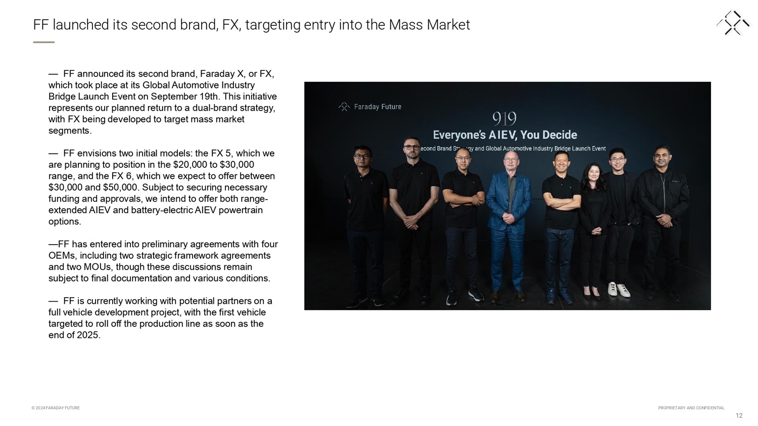 FF launched its second bíand, FX, taígeting entíy into the Mass Maíket — FF announced its second brand, Faraday X, or FX, w h i c h t ook p l ace at i ts G l ob a l Aut o m o ti v e I nd u s t r y Bridge Launch Event on September 19th. This initiative represents our planned return to a dual - brand strategy, with FX being developed to target mass market segments. — FF envisions two initial models: the FX 5, which we are planning to position in the $20,000 to $30,000 range, and the FX 6, which we expect to offer between $30,000 and $50,000. Subject to securing necessary funding and approvals, we intend to offer both range - extended AIEV and battery - electric AIEV powertrain options. — FF has entered into preliminary agreements with four OEMs, including two strategic framework agreements and two MOUs, though these discussions remain subject to final documentation and various conditions. — FF is currently working with potential partners on a full vehicle development project, with the first vehicle targeted to roll off the production line as soon as the end of 2025. © 2024 FARADAY FUľURE PROPRIEľARY AND CONFIDENľIAL 12