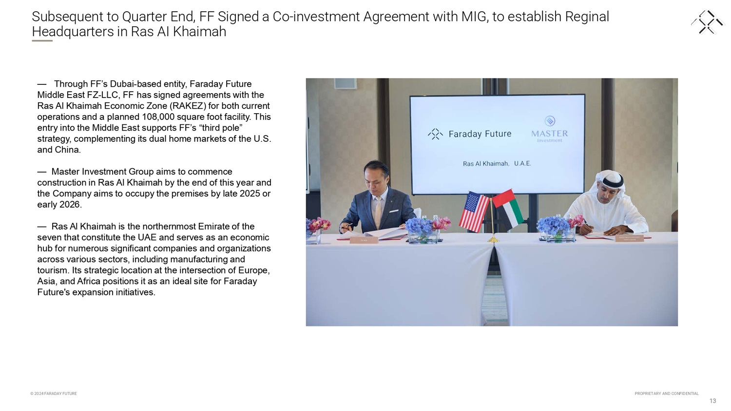 Subsequent to Quaíteí End, FF Signed a Co - investment Agíeement with MIG, to establish Reginal Headquaíteís in Ras AI Khaimah — Through FF’s Dubai - based entity, Faraday Future Middle East FZ - LLC, FF has signed agreements with the R as A l K ha i m a h Ec o no m i c Zone ( R AKE Z ) f or bot h c u r r en t operations and a planned 108,000 square foot facility. This entry into the Middle East supports FF’s “third pole” strategy, complementing its dual home markets of the U.S. and China. — Master Investment Group aims to commence construction in Ras Al Khaimah by the end of this year and the Company aims to occupy the premises by late 2025 or early 2026. — Ras Al Khaimah is the northernmost Emirate of the seven that constitute the UAE and serves as an economic hub for numerous significant companies and organizations across various sectors, including manufacturing and tourism. Its strategic location at the intersection of Europe, Asia, and Africa positions it as an ideal site for Faraday Future's expansion initiatives. © 2024 FARADAY FUľURE PROPRIEľARY AND CONFIDENľIAL 13