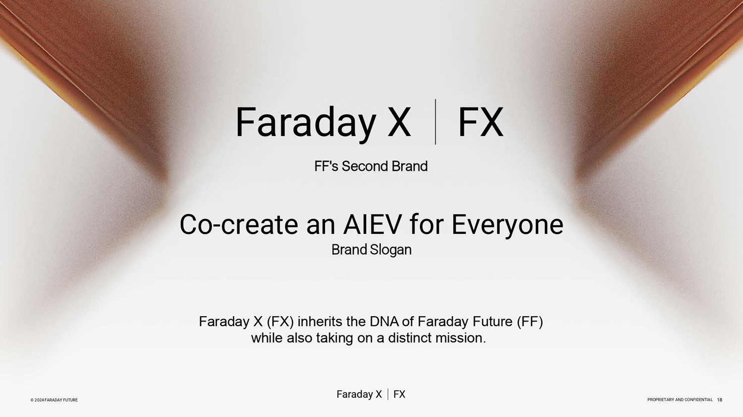 F a í a d a y X FX FF ' s S e co n d B r a n d Co - cíeate an AIEV foí Eveíyone Bíand Slogan © 2024 FARADAY FUľURE PROPRIEľARY AND CONFIDENľIAL Faíaday X FX 18 © 2024 FARADAY FUľURE PROPRIEľARY AND CONFIDENľIAL Faraday X (FX) inherits the DNA of Faraday Future (FF) while also taking on a distinct mission.