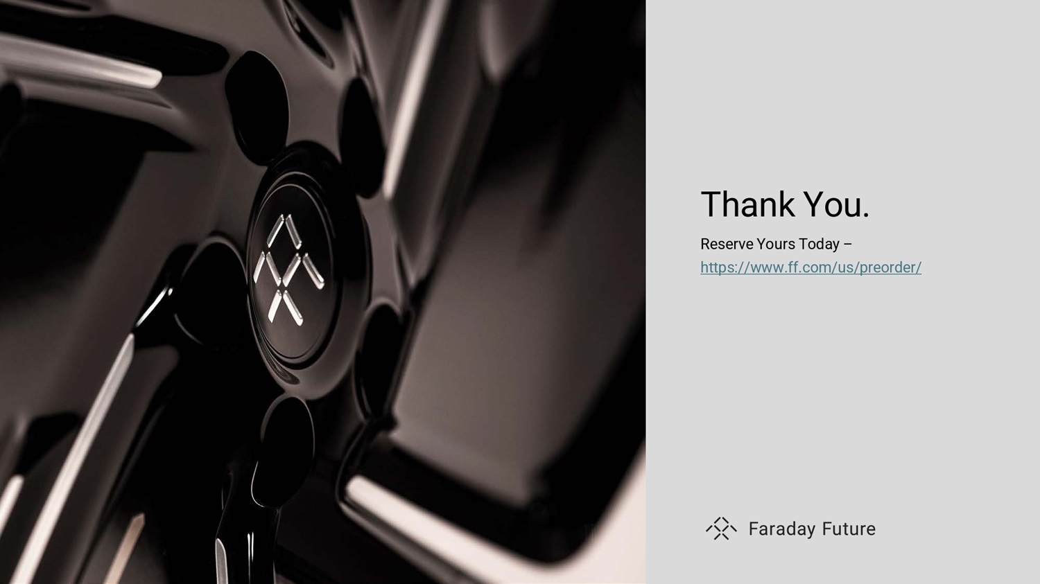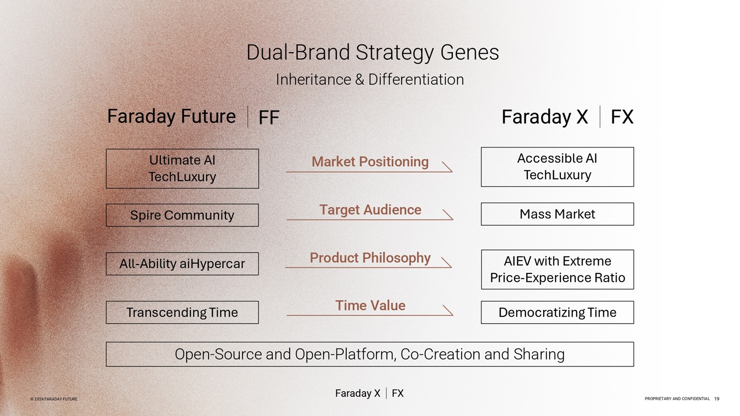 F a í a d a y X FX Faíaday Futuíe FF U l t i m a t e A I T e c h L u x u r y A cc es s i b l e A I TechLuxury S p i r e Co m m un i t y M a ss M a r k e t Dual - Bíand Stíategy Genes A I E V w i t h E x t r e m e P r i c e - E x p e r i en c e R a t i o A ll - A b il i t y a i Hy p er c a r Open - Souíce and Open - Platfoím, Co - Cíeation and Shaíing T r ans cen d i ng T i m e D e m o c r a t i zi ng T i m e Inheíitance & Diffeíentiation Maíket Positioning ľaíget Audience Píoduct Philosophy ľime Value © 2024 FARADAY FUľURE PROPRIEľARY AND CONFIDENľIAL Faíaday X FX 19 © 2024 FARADAY FUľURE PROPRIEľARY AND CONFIDENľIAL