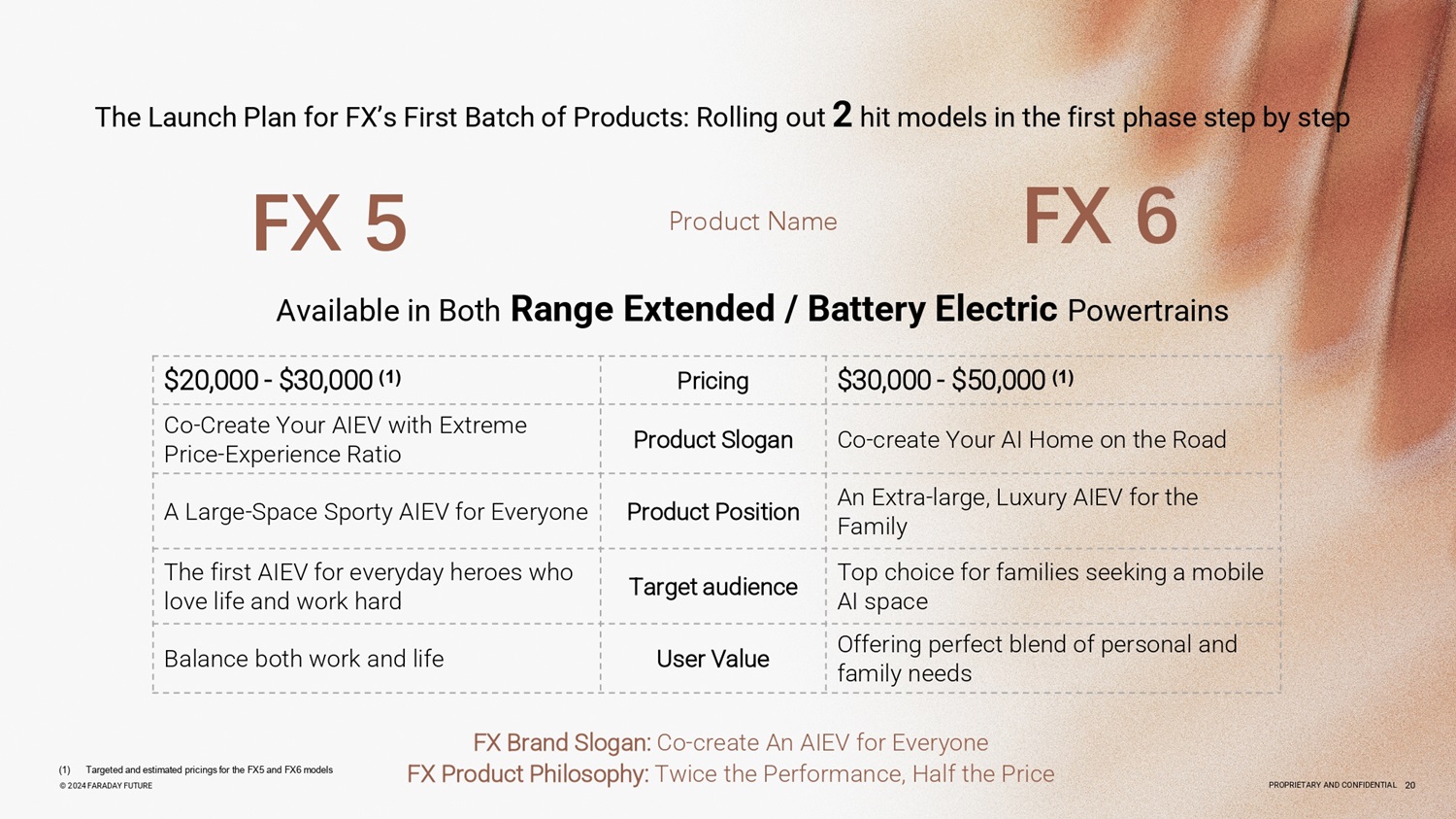 © 2024 FARADAY FUľURE PROPRIEľARY AND CONFIDENľIAL ľhe Launch Plan foí FX’s Fiíst Batch of Píoducts: Rolling out 2 hit models in the fiíst phase step by step P r o d u c t N ame FX 5 FX 6 Available in Both Range Extended / Batteíy Electíic Poweítíains FX Bíand Slogan: Co - cíeate An AIEV foí Eveíyone FX Píoduct Philosophy: Twice the Peífoímance, Half the Píice $ 30 , 00 0 - $ 50 , 0 0 0 ( 1) Píicing $ 20 , 00 0 - $ 30 , 0 0 0 ( 1) Co - cíeate Youí AI Home on the Road Píoduct Slogan Co - Cíeate Youí AIEV with Extíeme Píice - Expeíience Ratio An Extía - laíge, Luxuíy AIEV foí the Family Píoduct Position A Laíge - Space Spoíty AIEV foí Eveíyone Top choice foí families seeking a mobile AI space Taíget audience The fiíst AIEV foí eveíyday heíoes who love life and woík haíd Offeíing peífect blend of peísonal and family needs Useí Value Balance both woík and life PROPRIEľARY AND CONFIDENľIAL 20 (1) Targeted and estimated pricings for the FX5 and FX6 models © 2024 FARADAY FUľURE