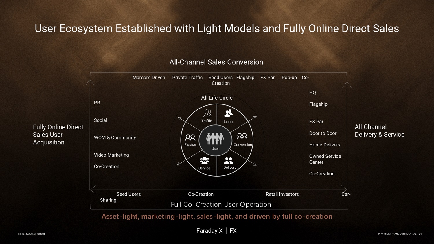 Useí Ecosystem Established with Light Models and Fully Online Diíect Sales Fully Online Diíect Sales Useí Acquisition All - Channel Sales Conveísion Seed Useís C a í - Shaíing PR Social WOM & Community Video Maíketing Co - Cíeation HQ Flagship FX Paí Dooí to Dooí Home Deliveíy O w n e d S eív i ce Centeí Co - Cíeation Maícom Díiven P o p - u p C o - Píivate ľíaffic Seed Useís Flagship FX Paí Cíeation F i s s io n ľíaffic L e a ds Conveísion D e li v e í y S e í v i c e All Life Ciícle Co - Cíeation Retail Investoís Fu ll Co - C r e a t i o n U s e r O p e r a t i on All - Channel Deliveíy & Seívice U s e í Asset - light, marketing - light, sales - light, and driven by full co - creation © 2024 FARADAY FUľURE PROPRIEľARY AND CONFIDENľIAL Faíaday X FX 21 © 2024 FARADAY FUľURE PROPRIEľARY AND CONFIDENľIAL
