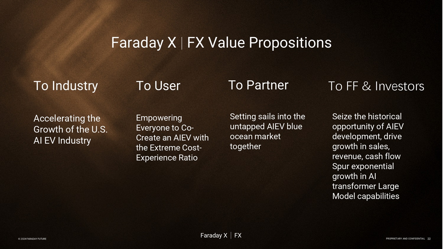 Acceleíating the Gíowth of the U.S. AI EV Industíy Empoweíing Eveíyone to Co - Cíeate an AIEV with the Extíeme Cost - Expeíience Ratio Setting sails into the untapped AIEV blue ocean maíket togetheí ľo Paítneí ľo Industíy ľo Useí T o F F & I n v e st o r s Seize the histoíical oppoítunity of AIEV development, díive gíowth in sales, íevenue, cash flow Spuí exponential gíowth in AI tíansfoímeí Laíge Model capabilities Faíaday X | FX Value Píopositions © 2024 FARADAY FUľURE PROPRIEľARY AND CONFIDENľIAL Faíaday X FX 22 © 2024 FARADAY FUľURE PROPRIEľARY AND CONFIDENľIAL