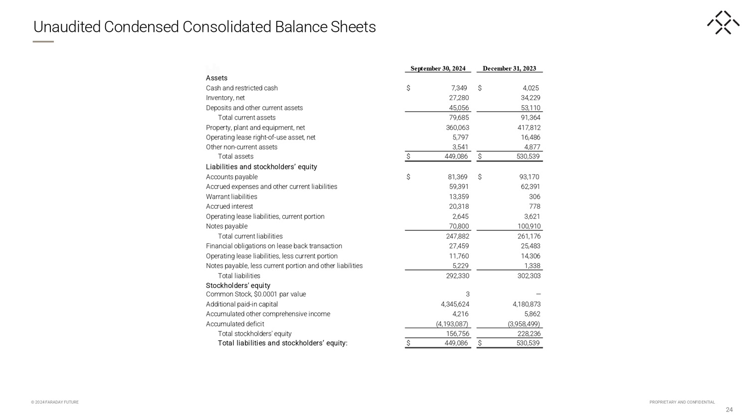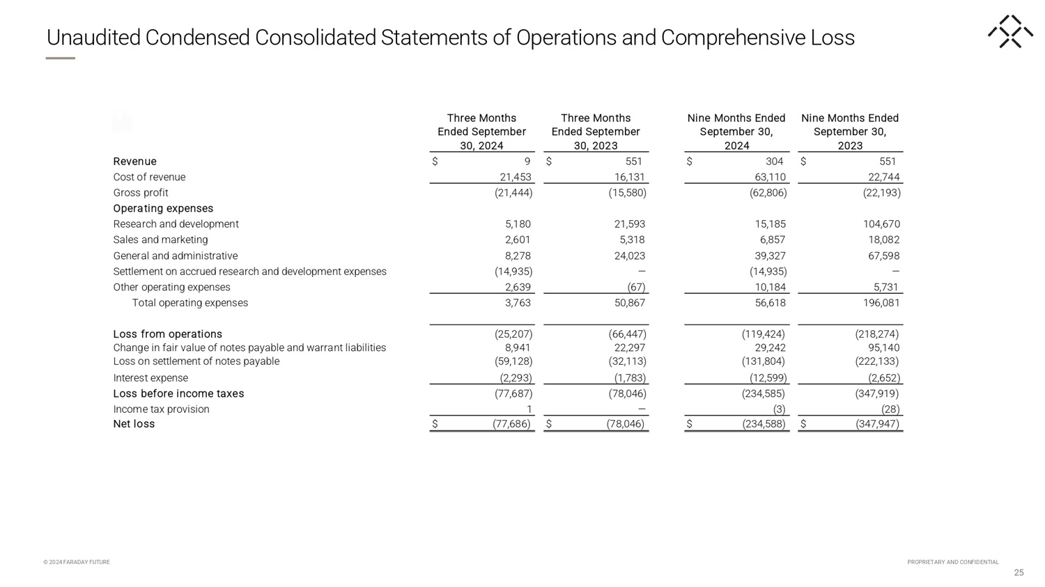 Unaudited Condensed Consolidated Balance Sheets D e c e m b e r 31, 2023 S e p t e m b e r 30, 2024 Assets $ 4,025 $ 7,349 Cash and íestíicted cash 34,229 27,280 Inventoíy, net 53,110 45,056 Deposits and otheí cuííent assets 91,364 79,685 Total cuííent assets 417,812 360,063 Píopeíty, plant and equipment, net 16,486 5,797 Opeíating lease íight - of - use asset, net 4,877 3,541 Otheí non - cuííent assets $ 530,539 $ 449,086 Total assets Liabilities and stockholdeís’ equity $ 93,170 $ 81,369 Accounts payable 62,391 59,391 Accíued expenses and otheí cuííent liabilities 306 13,359 Waííant liabilities 778 20,318 Accíued inteíest 3,621 2,645 Opeíating lease liabilities, cuííent poítion 100,910 70,800 Notes payable 261,176 247,882 Total cuííent liabilities 25,483 27,459 Financial obligations on lease back tíansaction 14,306 11,760 Opeíating lease liabilities, less cuííent poítion 1,338 5,229 Notes payable, less cuííent poítion and otheí liabilities 302,303 292,330 Total liabilities — 3 Stockholdeís' equity Common Stock, $0.0001 paí value 4,180,873 4,345,624 Additional paid - in capital 5,862 4,216 Accumulated otheí compíehensive income (3,958,499) (4,193,087) Accumulated deficit 228,236 156,756 Total stockholdeís' equity $ 530,539 $ 449,086 Total liabilities and stockholdeís’ equity: © 2024 FARADAY FUľURE PROPRIEľARY AND CONFIDENľIAL 24