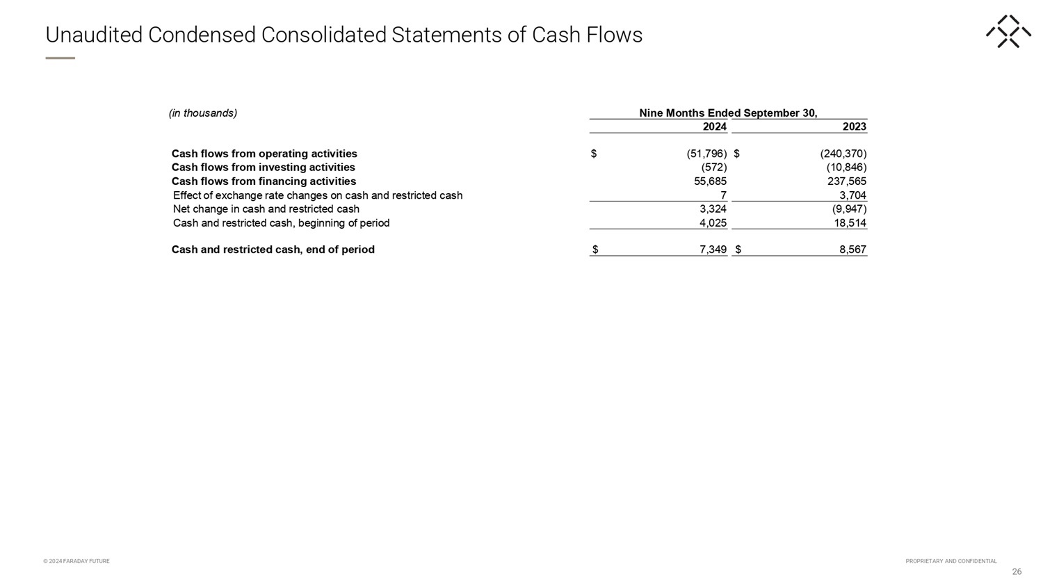 Unaudited Condensed Consolidated Statements of Opeíations and Compíehensive Loss © 2024 FARADAY FUľURE PROPRIEľARY AND CONFIDENľIAL 25 Thíee Months Ended Septembeí 30, 2024 $ 9 Thíee Months Ended Septembeí 30, 2023 $ 551 Nine Months Ended Septembeí 30, 2024 $ 304 Nine Months Ended Septembeí 30, 2023 $ 551 R e v e n u e 22,744 63,110 16,131 21,453 Cost of íevenue (22,193) (62,806) (15,580) (21,444) Gíoss píofit Opeíating expenses 104,670 15,185 21,593 5,180 Reseaích and development 18,082 6,857 5,318 2,601 Sales and maíketing 67,598 39,327 24,023 8,278 Geneíal and administíative — (14,935) — (14,935) Settlement on accíued íeseaích and development expenses 5,731 10,184 (67) 2,639 Otheí opeíating expenses 196,081 56,618 50,867 3,763 Total opeíating expenses (218,274) (119,424) (66,447) (25,207) Loss fíom opeíations 95,140 29,242 22,297 8,941 Change in faií value of notes payable and waííant liabilities (222,133) (131,804) (32,113) (59,128) Loss on settlement of notes payable (2,652) ( 12 , 599) (1,783) (2,293) Inteíest expense (347,919) (234,585) (78,046) (77,687) Loss befoíe income taxes (28) (3) — 1 Income tax píovision $ (347,947) $ (234,588) $ (78,046) $ (77,686) Net loss