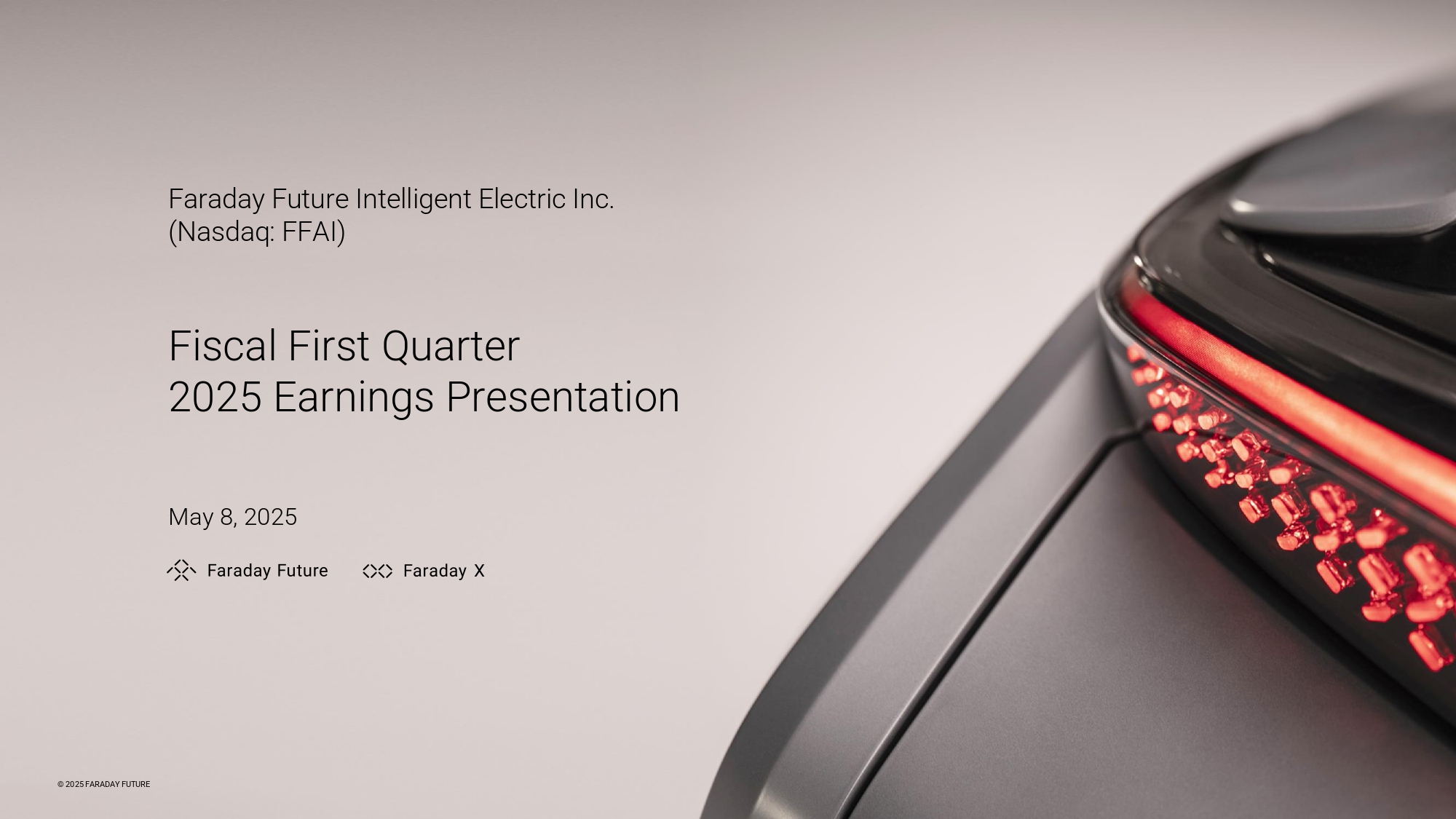 © 2024 FARADAY FUTURE Faraday Future Intelligent Electric Inc. (Nasdaq: FFAI) Fiscal First Quarter 2025 Earnings Presentation May 8, 2025 = © 2025 FARADAY FUTURE